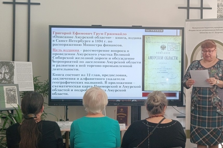 Заинтересовала присутствующих выставка редких книг: Григорий Ефимович Грум-Гржимайло «Описание Амурской области», изданной в Санкт-Петербурге в 1894 г. по распоряжению Министра финансов и книга студента Восточного института Эдуарда Альфредовича Лабербиса «Река Амур» : (Краткий очерк судоходства и торговли), изданной типографией Далёкая Окраина в 1913 году, из фонда отдела ЦНБ ДВО РАН при Тихоокеанском институте географии ДВО РАН. Прочитали отрывок с описанием природы реки Амур ниже её слияния с рекой Буреей из труда Г.Е. Грум-Гржимайло и отрывок с описанием Амура из романа И. Басаргина «В горах Тигровых». Обратили внимание на описание племен илоу и сушеней, приведенное в редкой книге и повести Басаргина. Отметили, что в книге Э.А. Лабербиса имеются сведения о селении Куликовка, среди основателей которой были Басаргины, переселившиеся с берегов Амура в Приморье в самом конце 19 века и основавшие селение Каменку на правом берегу реки Уссури.