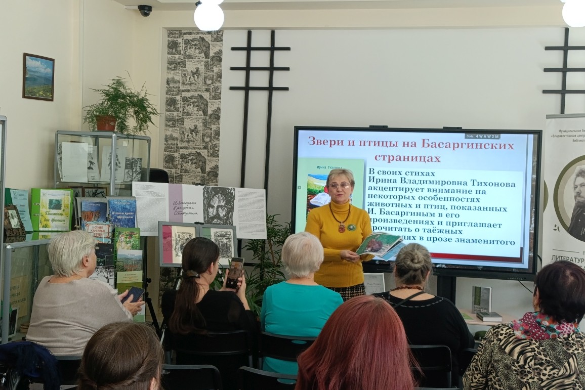 Книгу «Звери и птицы на Басаргинских страницах» представила автор Ирина Владимировна Тихонова. В своих стихотворениях она акцентирует внимание на некоторых особенностях животных и птиц, показанных И. Басаргиным в его произведениях и приглашает прочитать о таёжных обитателях в прозе знаменитого земляка.