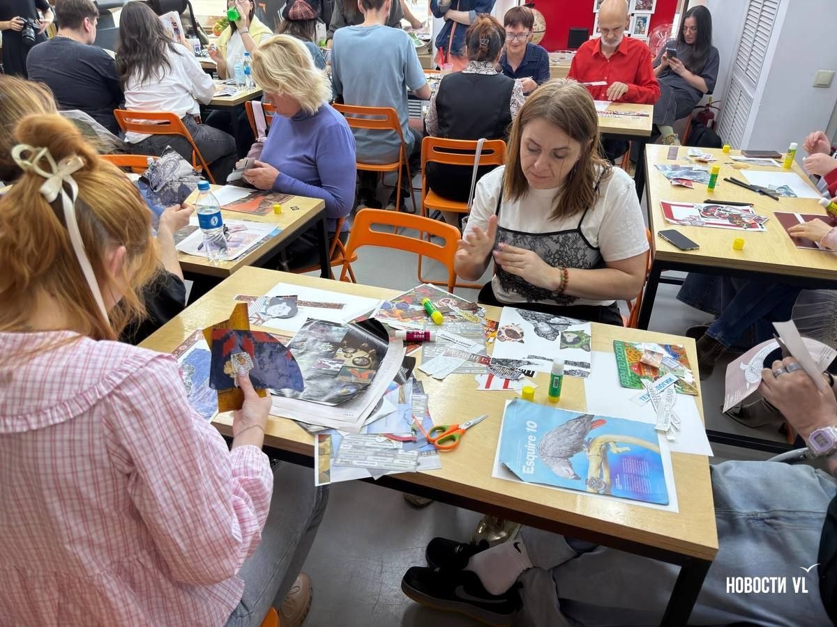 Нужные узоры и детали вырезали из альбома и журналов, с раскрасок и распечатанных на цветном принтере фотографий. Кто-то просто собирал на холсте детали, которые ему откликались, другие, наоборот, собирали картину, исходя из конкретного замысла, и, долго перебирая картинки, выбирали лишь то, что ляжет в композицию сюжета. Например, пара участников сделала коллаж, посвящённый Камчатке и её коренному народу, а женщина за соседним столом углубилась в культуру России и наклеила на лист балалайку и матрёшку, раскрашенные под хохлому. А её сосед Александр углубился в историю Владивостока.