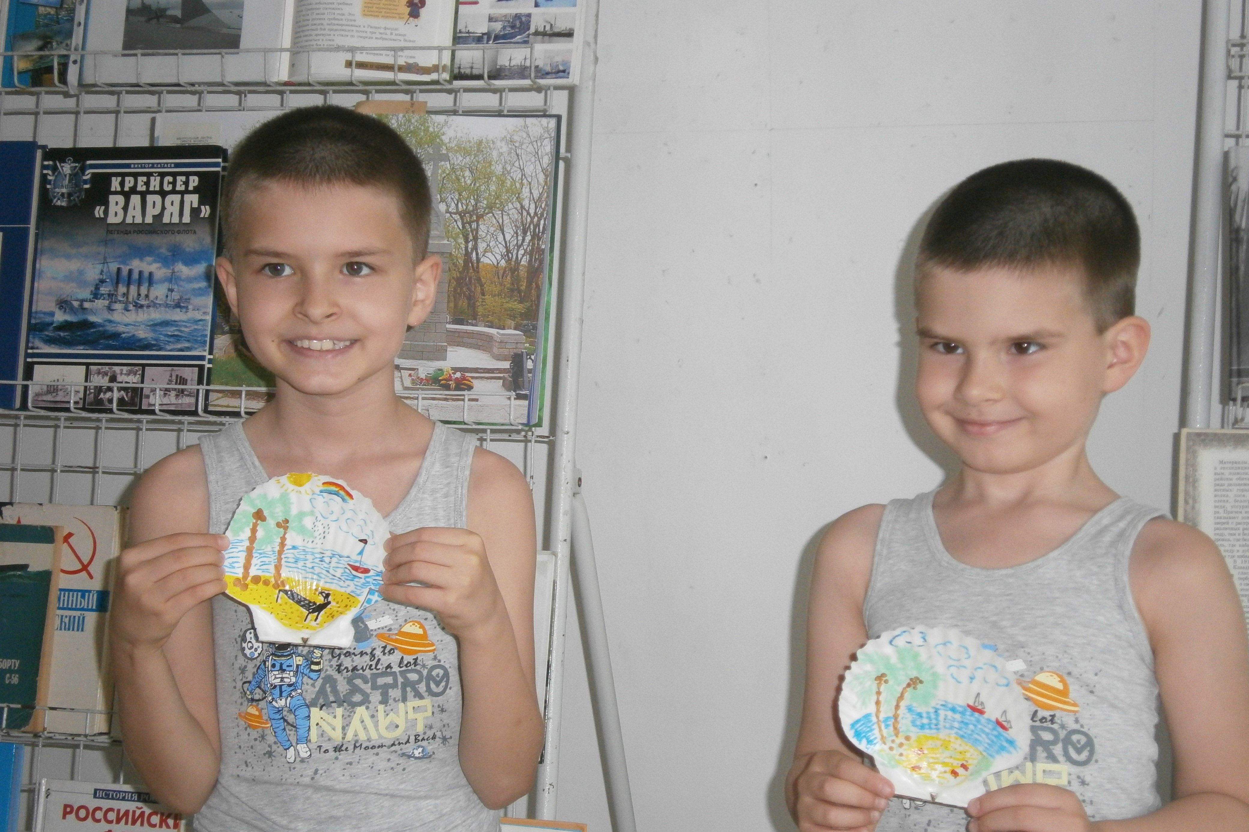 В Приморском крае проживают люди около 180 национальностей. 14 июля в библиотеке №3 сотрудники вместе с детьми решили рассмотреть элементы быта, традиций и особенностей культуры коренных народов приморья – удэгейцев, нанайцев, орочей и тазов. И начать решили со сказок, а именно «Таежных сказок» с замечательными иллюстрациями Геннадия Павлишина. Прочитали нанайскую сказку «Гарпамди – меткий стрелок», рассмотрели картинки, оценили народный костюм и привычные занятия нанайцев в древности. Чтобы закрепить материал, посмотрели презентацию о народном костюме. В тайгу попали с помощью интерактивной книги В.К. Арсеньева «Встречи в тайге». Побывали в доме удэгейца-зверолова, отгадали загадки о животных, которые обитают в тайге, и выяснили, на кого охотились в те времена. Попутно вспомнили самого известного гольда Дерсу Узала (гольды – устаревшее название нанайцев) и его манеру обращения к жителям тайги. Размышляя о традиционном занятии рыболовством, очень удивились гольдской одежде и обуви из рыбьей кожи. Шаманская маска с татуировкой и бородой вызвала шквал эмоций. Дети даже изобразили танец с бубном. А потом была сложная задача выбрать, как же раскрасить гребешковую ракушку. Решили, что такая работа вполне в фольклорном стиле. Ева изобразила пейзаж в японском стиле. Эта работа завоевала приз зрительских симпатий. Малиновый закат у Ксюши, пляж у Димы, флаг России у Вики, море и закат у Светланки, Крым у Левы – ребята просто фонтанировали идеями.