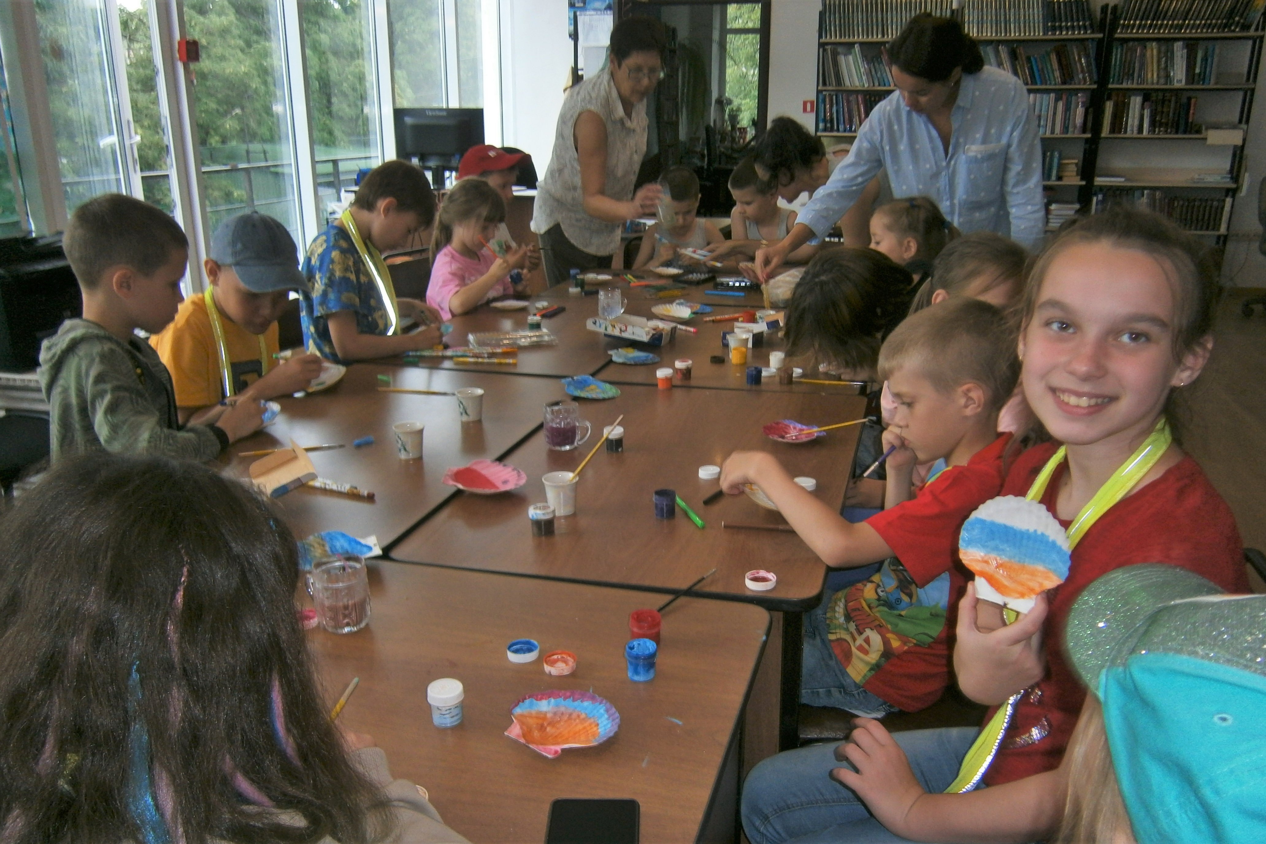 В Приморском крае проживают люди около 180 национальностей. 14 июля в библиотеке №3 сотрудники вместе с детьми решили рассмотреть элементы быта, традиций и особенностей культуры коренных народов приморья – удэгейцев, нанайцев, орочей и тазов. И начать решили со сказок, а именно «Таежных сказок» с замечательными иллюстрациями Геннадия Павлишина. Прочитали нанайскую сказку «Гарпамди – меткий стрелок», рассмотрели картинки, оценили народный костюм и привычные занятия нанайцев в древности. Чтобы закрепить материал, посмотрели презентацию о народном костюме. В тайгу попали с помощью интерактивной книги В.К. Арсеньева «Встречи в тайге». Побывали в доме удэгейца-зверолова, отгадали загадки о животных, которые обитают в тайге, и выяснили, на кого охотились в те времена. Попутно вспомнили самого известного гольда Дерсу Узала (гольды – устаревшее название нанайцев) и его манеру обращения к жителям тайги. Размышляя о традиционном занятии рыболовством, очень удивились гольдской одежде и обуви из рыбьей кожи. Шаманская маска с татуировкой и бородой вызвала шквал эмоций. Дети даже изобразили танец с бубном. А потом была сложная задача выбрать, как же раскрасить гребешковую ракушку. Решили, что такая работа вполне в фольклорном стиле. Ева изобразила пейзаж в японском стиле. Эта работа завоевала приз зрительских симпатий. Малиновый закат у Ксюши, пляж у Димы, флаг России у Вики, море и закат у Светланки, Крым у Левы – ребята просто фонтанировали идеями.