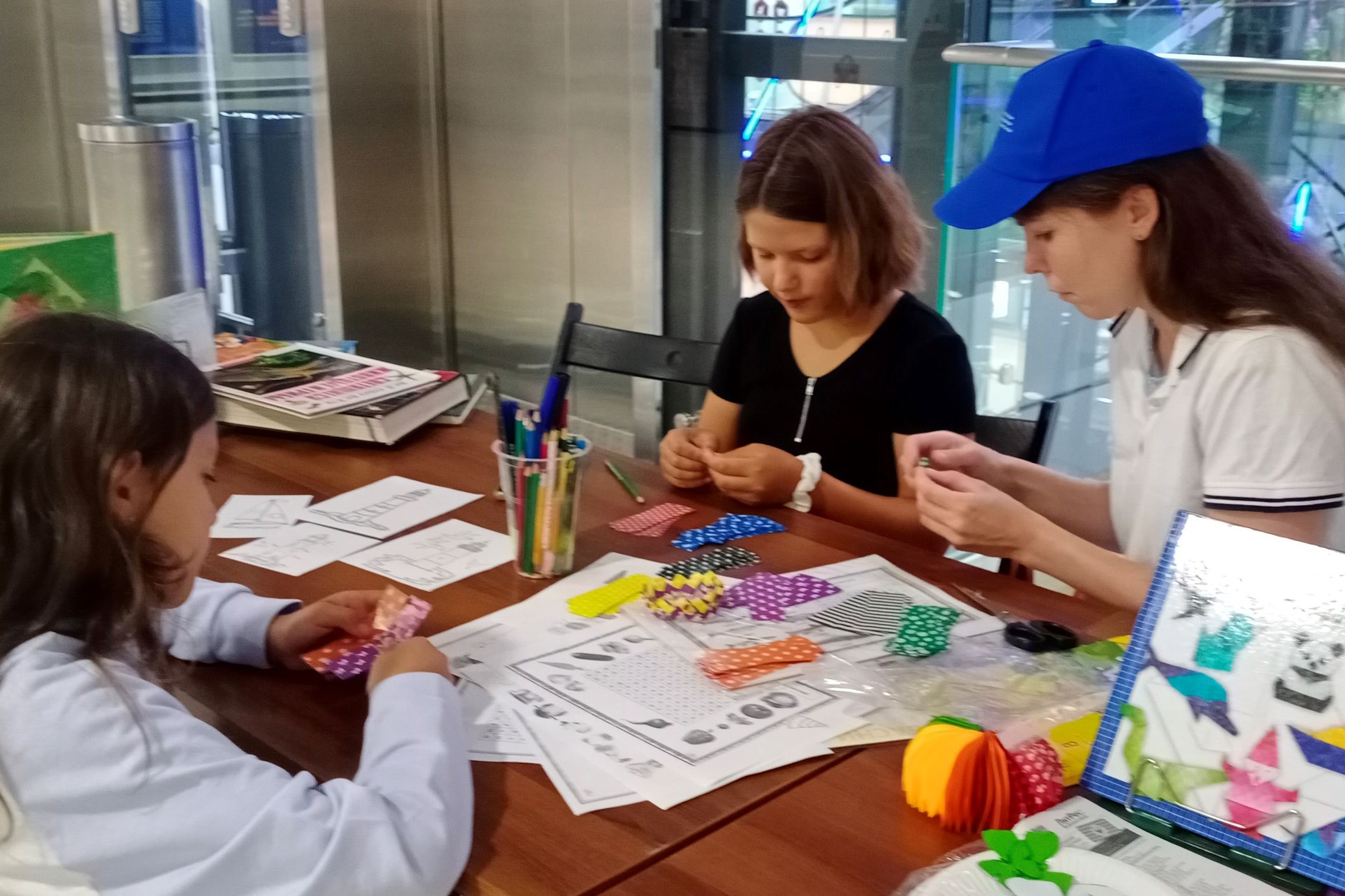 Так же дети на площадке всегда могут позаниматься творчеством: порисовать, раскрасить тематическую раскраску и смастерить поделку. В этот раз это были удивительно яркие, красочные и необычные браслеты на руку в технике складывания из «волшебной» бумаги, которые можно было украсить разноцветными бусинками. Получился замечательный летний аксессуар, девчонки были в восторге и даже пообещали научить своих друзей простым навыкам бумаготворчества. А ещё разгадывали загадки, кроссворды и сканворды, взрослые получали листовки с информацией о библиотеках, о возможности получить доступ к ЛитРес.