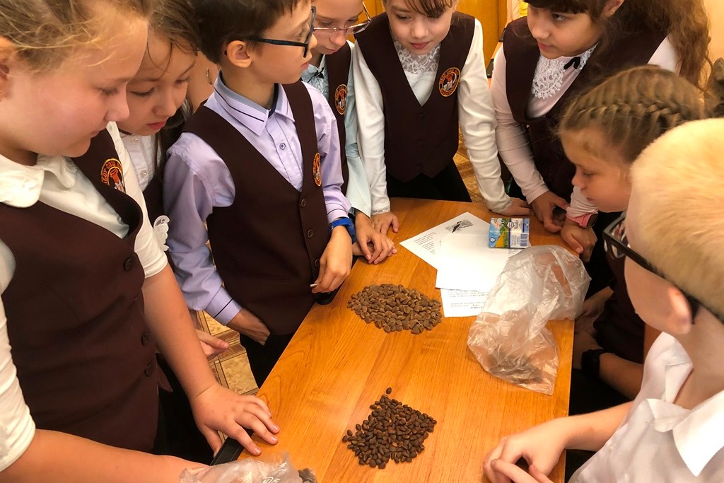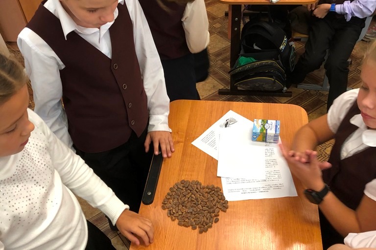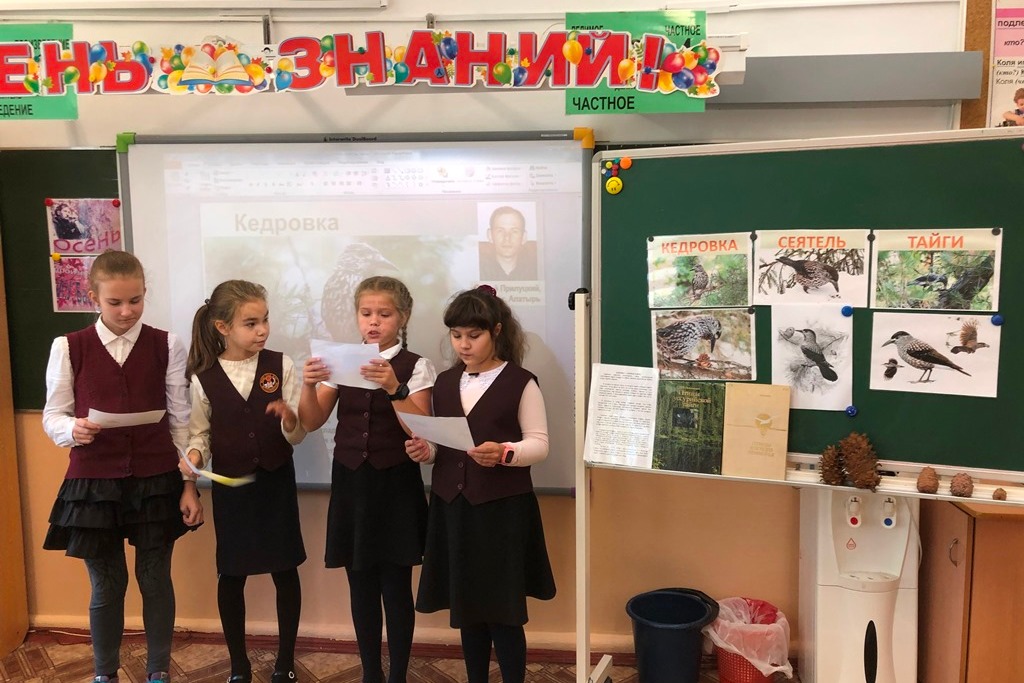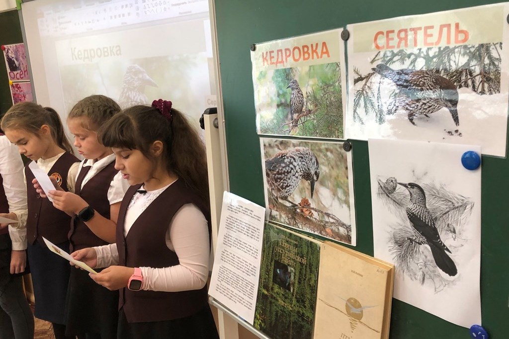 Все ребята класса получили изображение кедровки – птицы-лесовода, текст стихотворения «Кедровка» Сергея Прилуцкого и текст рассказа И.У. Басаргина «Кедровка – сеятель тайги». Прочитали рассказ, используя аналитический способ чтения: читали внимательно, анализируя отдельные фрагменты, стараясь полностью понять текст и идею рассказа; обращали внимание на ударения в словах. Отметили, что писатель подмечает характерные особенности поведения птиц и животных уссурийской тайги, передает эпизоды жизни ее обитателей, свои ощущения живым и образным языком таежника. Отметили на полученном рисунке размеры птицы, размах ее крыльев и др. Познакомились с мнением знатока российской орнитофауны С.А. Бутурлина: «Кедровка имеет такое же сходство с дятлом, как и с сойкой»; …кажется, что «выглядит неловкою и даже неуклюжею, но на самом деле она и ловка, и резва; по земле она ходит очень хорошо, а также с большою сноровкой прыгает по сучьям и веткам или цепляется за ствол с ловкостью синицы, так что про нее совершенно справедливо можно сказать, что она действительно лазает по деревьям». Обратили внимание на то как переносит кедровка свои запасы, выяснили сколько орешков кедра сибирского и кедра корейского может поместиться в подъязычном мешке птицы лесовода. Узнали, что в сибирском городе Томск установлен памятник кедровке – птице, которая играет большую роль в жизни тайги как распространитель семян деревьев.