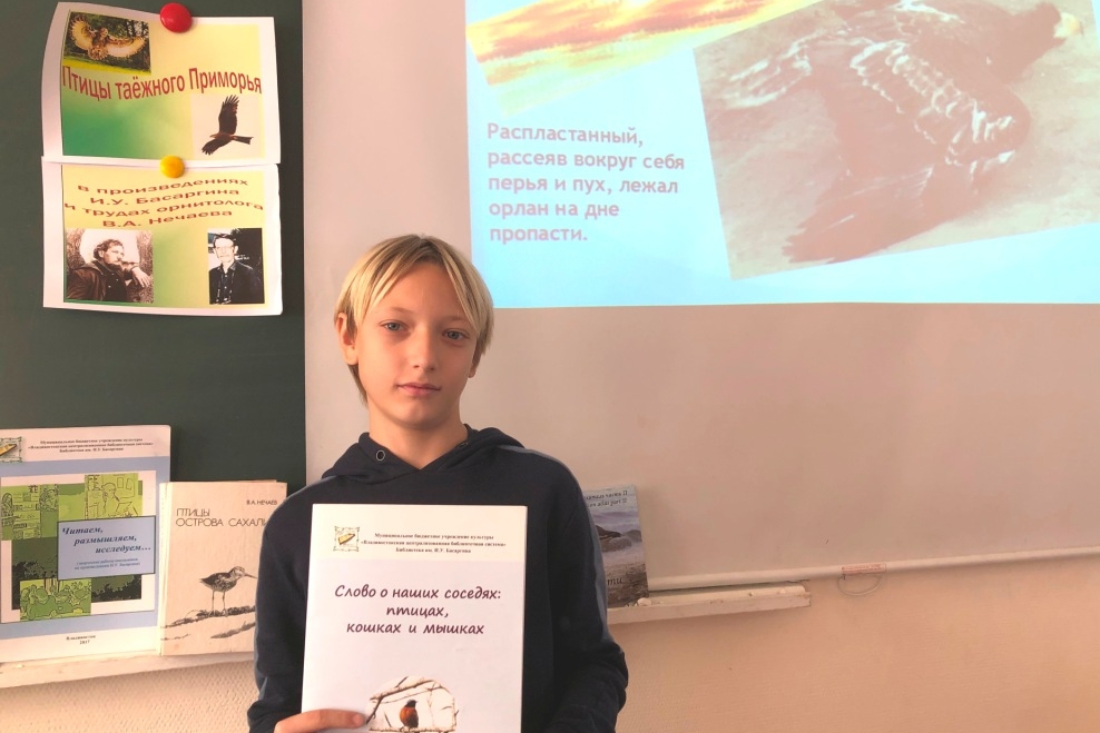 Учащиеся узнали, что в 2021 году исполнилось 85 лет со дня рождения известного дальневосточного орнитолога В.А. Нечаева, познакомились с биографией, исследованиями лауреата премии им. профессора А.И. Куренцова, настоящего натуралиста, внёсшего огромный вклад не только в орнитологию, но и в ботанику, чьи находки редких растений хранятся в Гербарии Биолого-почвенного института, внесены в ботанические статьи разных специалистов и в «Определитель сосудистых растений советского Дальнего Востока», с его книгами, представленными на выставке.
