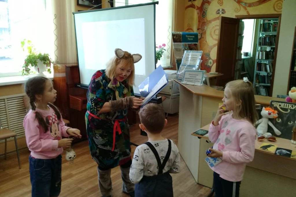 Не успели дети разойтись, как из-за библиотечных стеллажей с книгами появилась ученая кошка…, наверное, она заскочила в библиотеку, чтобы погреться. Звоня в колокольчик, она пригласила детей принять участие в веселой викторине «Коты, кошки и котята». Веселые вопросы о любимых четвероногих питомцах были простыми, дети с удовольствием на них отвечали. Вместе с детьми вспомнили песенки про кошек и хором их исполнили. Также детям показали книжную выставку, где можно было полистать энциклопедии об уходе за кошками и рассматривать открытки.