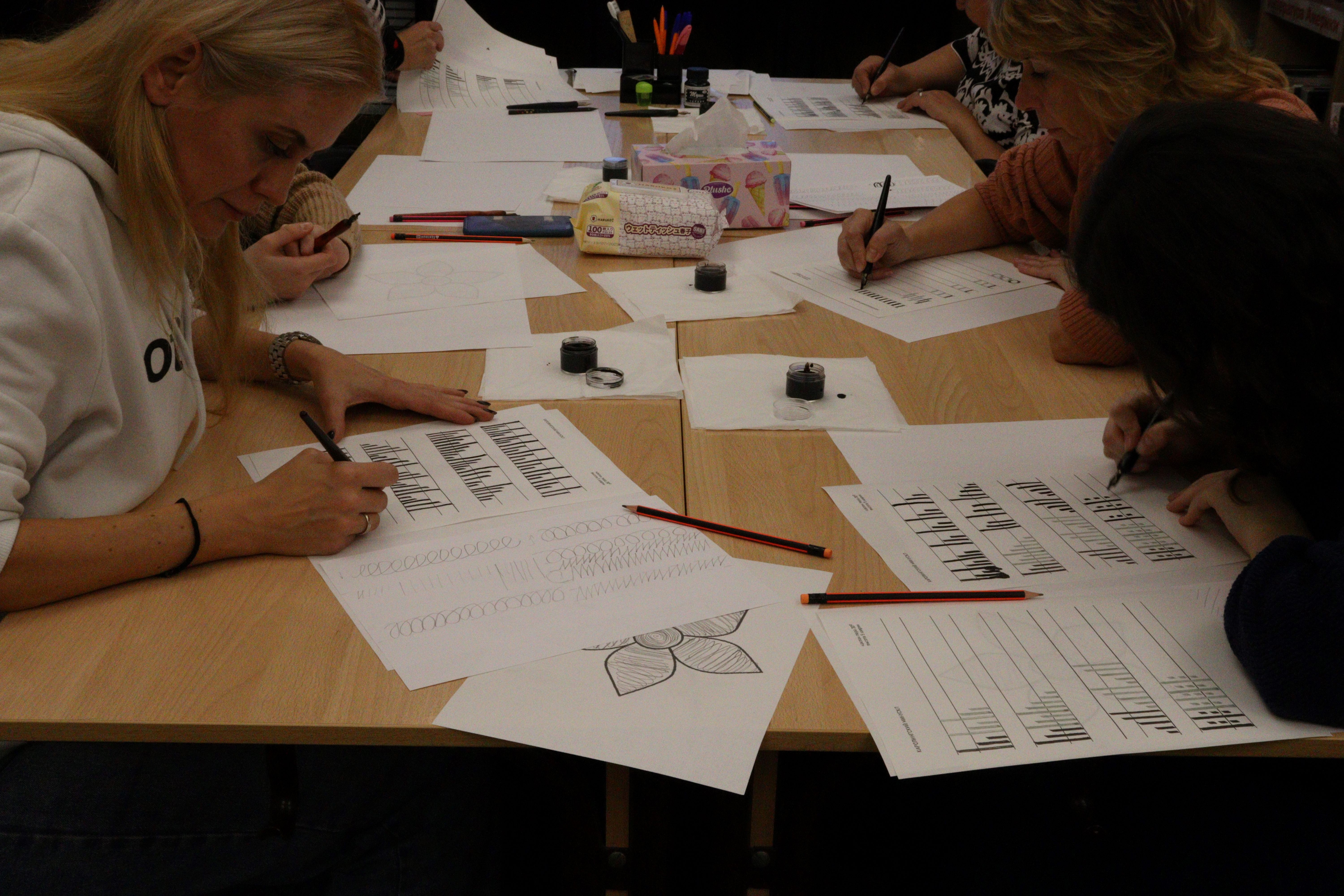 На занятии присутствующие познакомились с азами каллиграфии, освоили правильное положение пера при письме, изучили несколько видов разминок для разогрева кисти, познакомились с разными видами почерковых форм и шрифтов (Каролингский минускул, Канцелярский курсив), а также попробовали техники работы ширококонечным и остроконечным пером.