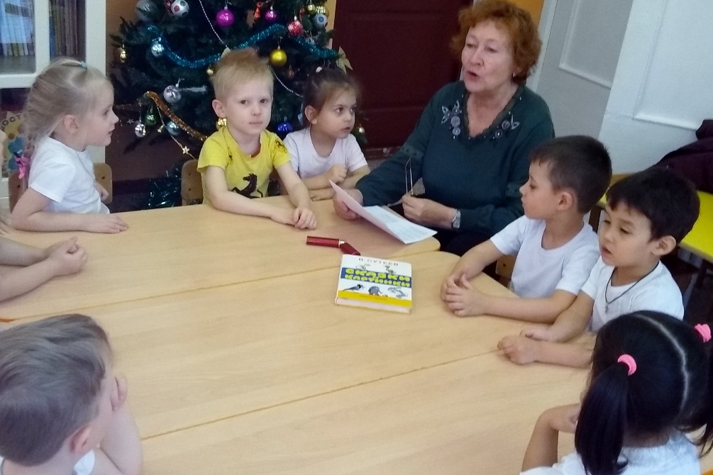 Знакомство дошколят из МБДОУ ЦРР детсад № 30 с творчеством писателя и художника Владимира Сутеева в этот зимний месяц библиотека №17 начала с его сказки «Ёлка». Это новогодняя история о том, как Снеговик ходил к Деду Морозу за ёлкой по просьбе ребят. Сутеев Владимир Григорьевич замечательно понимал детей и подарил детям радость, яркие краски и веселые истории. На первый взгляд, эти истории очень просты, и ребёнок, сопереживая, учится отличать плохое от хорошего, наблюдает, как добрые персонажи ведут борьбу с опасными злодеями. При этом эти страшные персонажи не пугают малышей, т. к. они показаны с юмором.