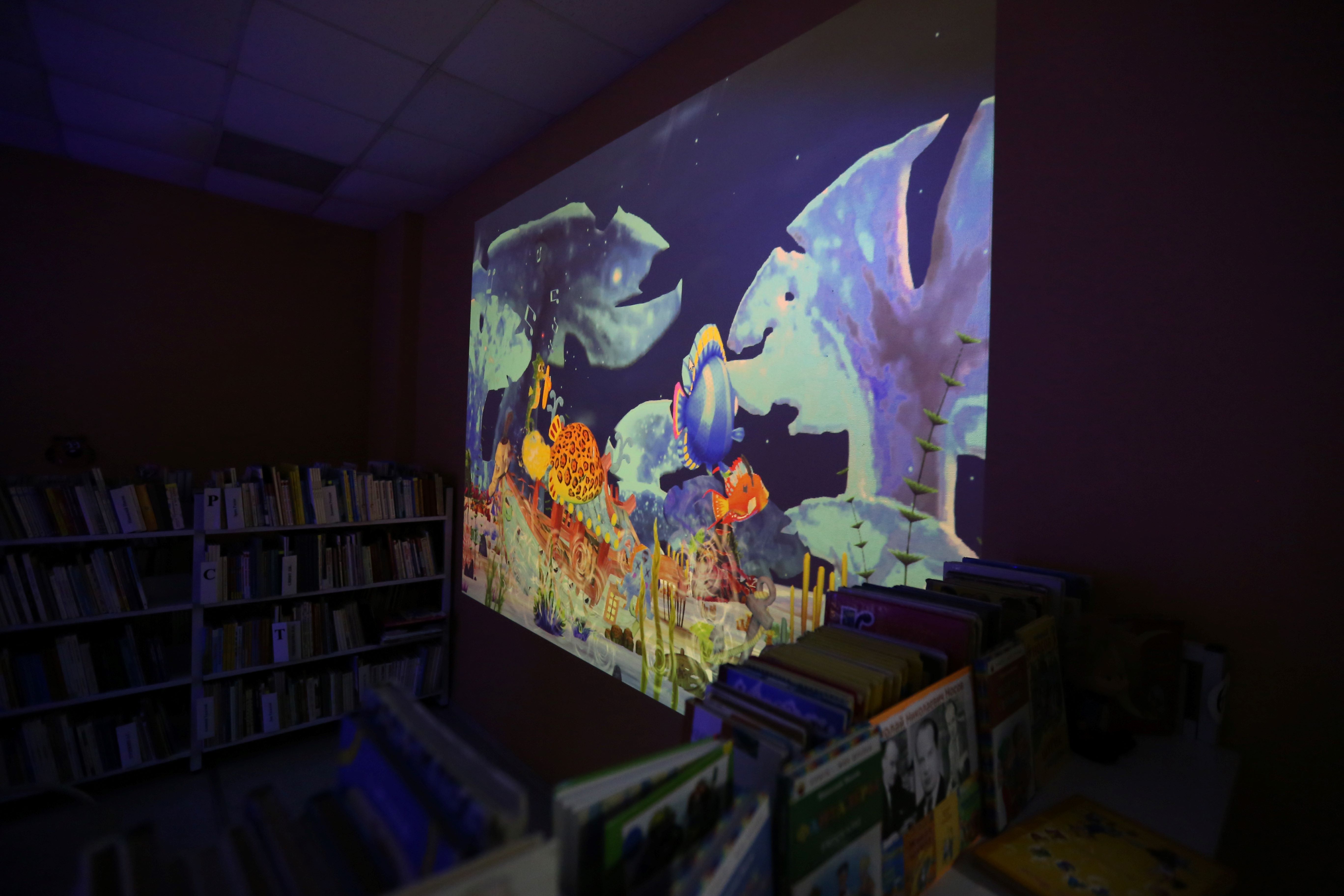 Дети раскрасили специальные шаблоны различных рыб и морских животных для сканирования и отображения рисунков в режиме «Океан» в программе «Ожившие рисунки». С помощью интерактивного проектора «Interactive Project» детские рисунки отобразились на стене детского абонемента, что вызвало неописуемый восторг детей. С помощью специального мяча ребята выбивали картинки на стене и открывали сундуки с сокровищами.