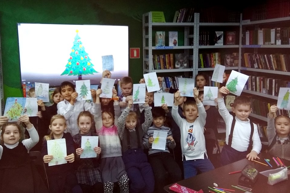 Следующим блоком под видео урок дети учились рисовать новогоднюю ёлочку, в результате, ровно 19 картинок зелёных ёлочек будут вручены по приходу домой мамочкам с приветом от библиотеки.