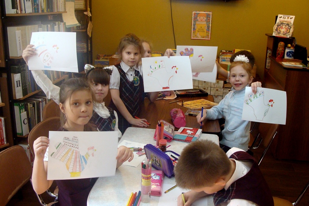 Ну и как же без творчества. Наши юные читатели получили шаблоны ладошек в виде петушков. Дети вмиг их сделали нарядными, раскрасив под дымковскую и филимоновскую игрушку.