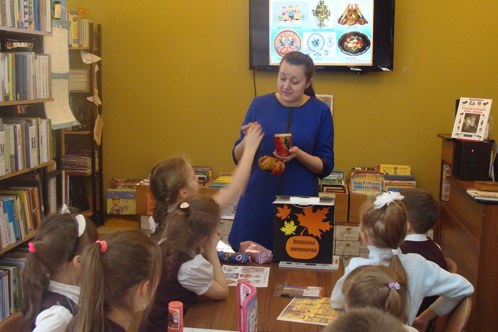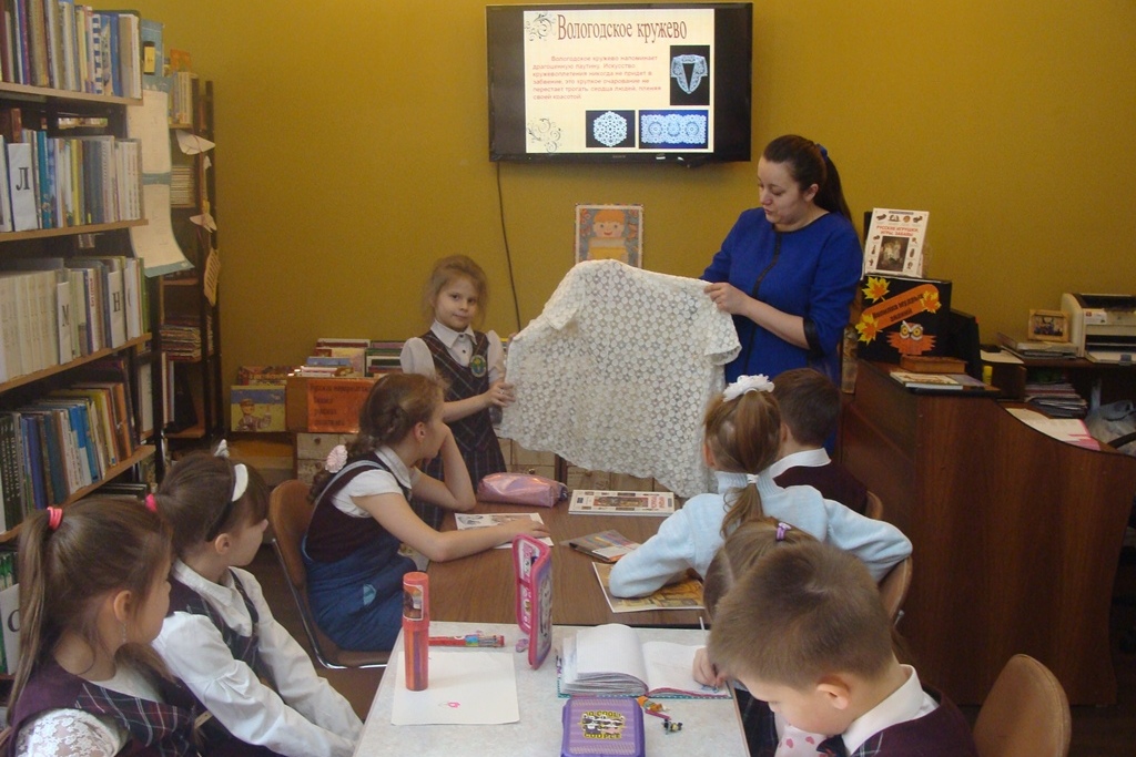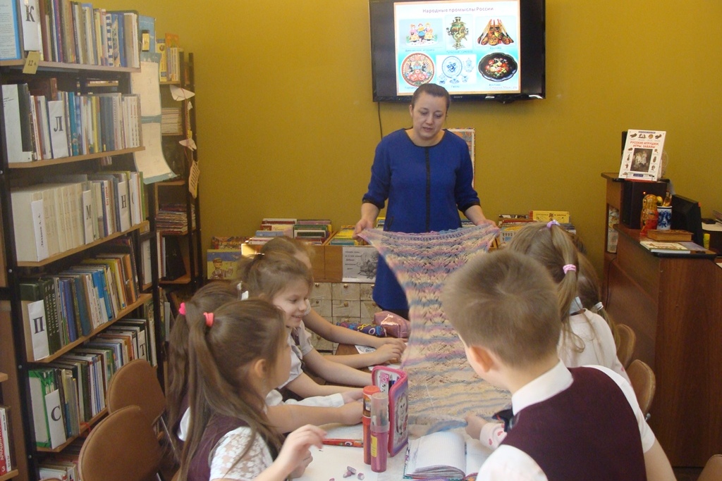 Второклассники познакомились с презентацией «Народные промыслы России». Яркие красочные изделия из золотой хохломы, лаковой палехской росписи, берестяные туески и вырезные куклы, корзины из ивовых прутьев, вологодские кружева, нарядная дымковская игрушка и сине – белая гжель радовали взоры детей.