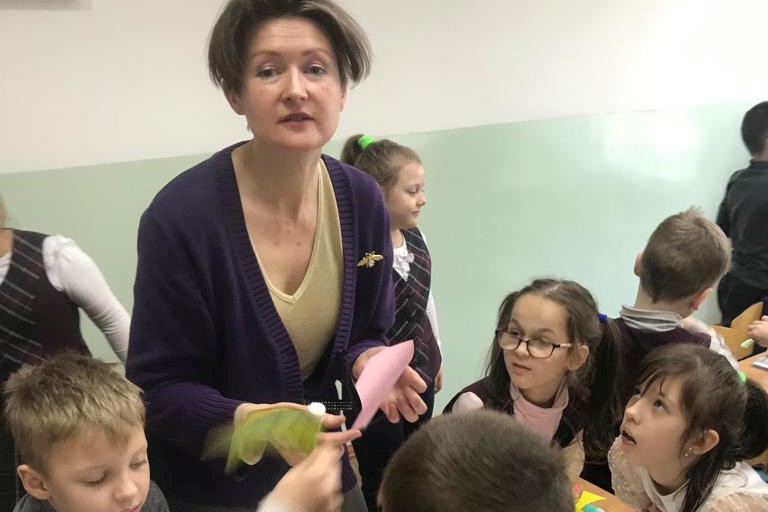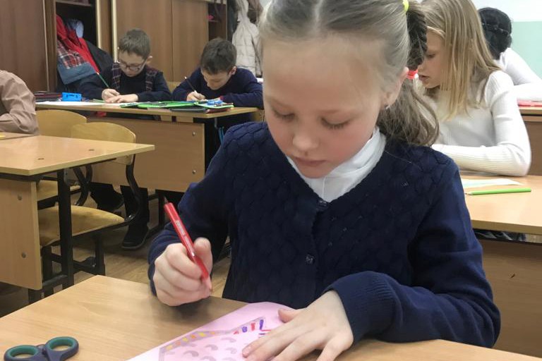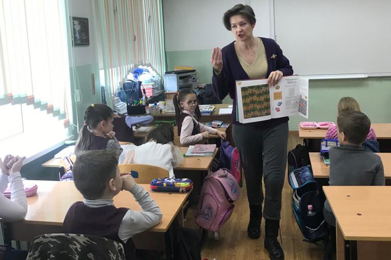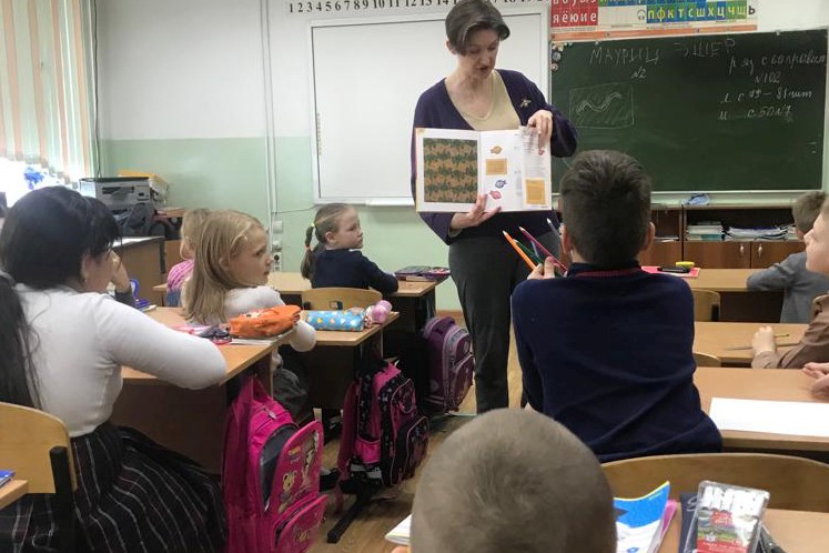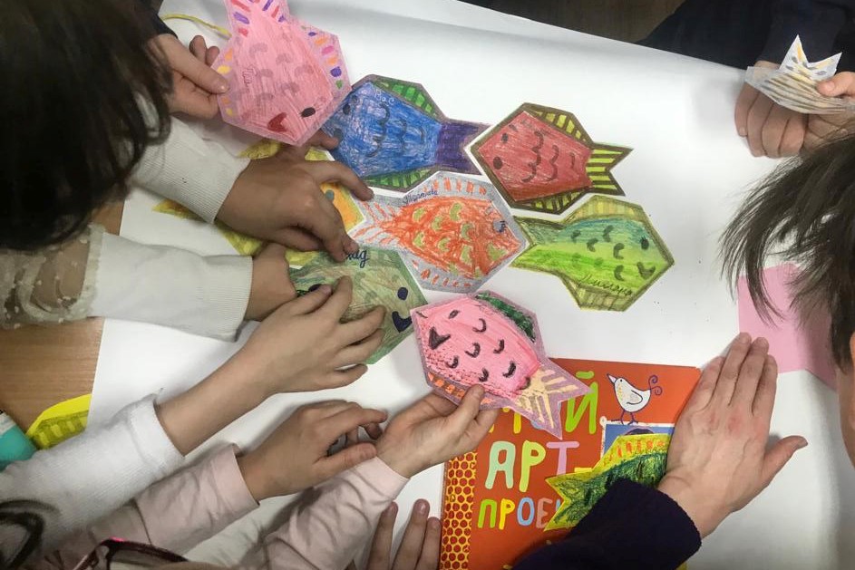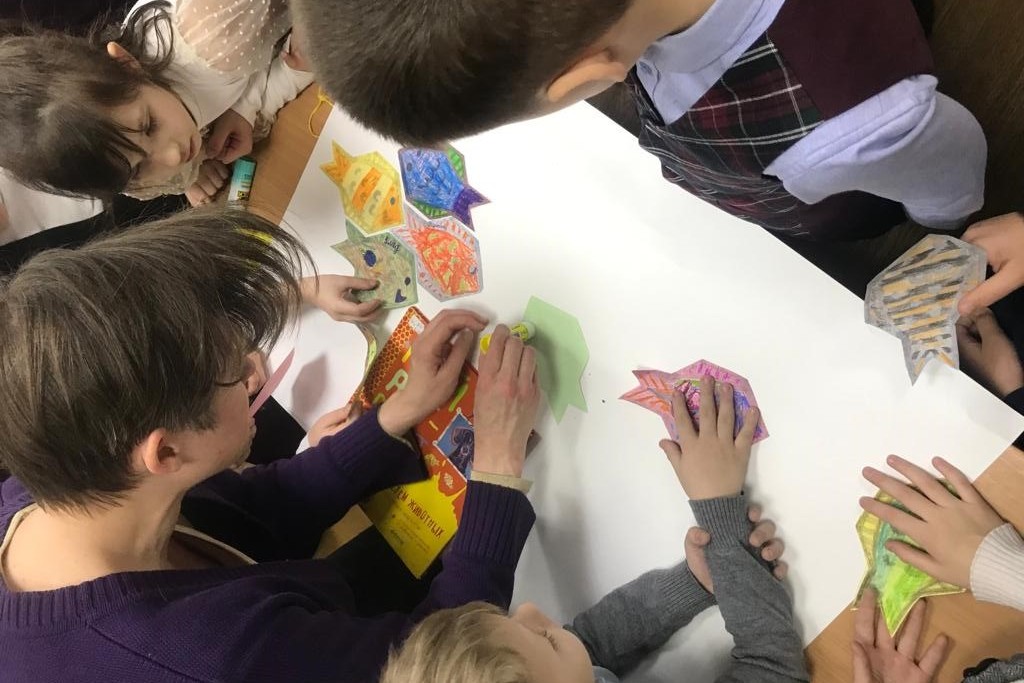 Второклашки на уроке сделали аппликацию «Большая перемена», каждый для этого вырезал из цветной бумаги и раскрасил рыбу. Ведь школьники в перемену действительно напоминают стайку рыб, снующих туда-сюда по коридору. Идею для аппликации библиотека почерпнула в книге Сьюзи Брукс «Мой арт-проект. Рисуем животных» в разделе, посвященном творчеству Маурица Эшера.