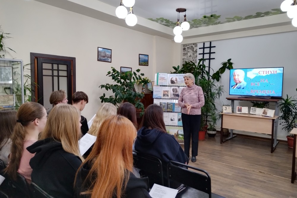 15 марта в библиотеке им. И.У. Басаргина для учащихся 10 «А» класса МБОУ «СОШ № 57» прошел литературный час, посвященный столетию со дня рождения Расула Гамзатова, по программе литературной гостиной «Вектор чтения».