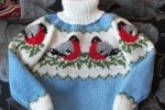 Все схемы для вязания беру в интернете, это очень удобно, быстро и бесплатно. Однажды там я увидела свитер со снегирями. Сразу захотелось связать такой своему внуку к Новому Году. Получился весёлый, зимний свитер. С этой работой я поучаствовала в конкурсе «Вяжем нашим малышам» и заняла 1 место.