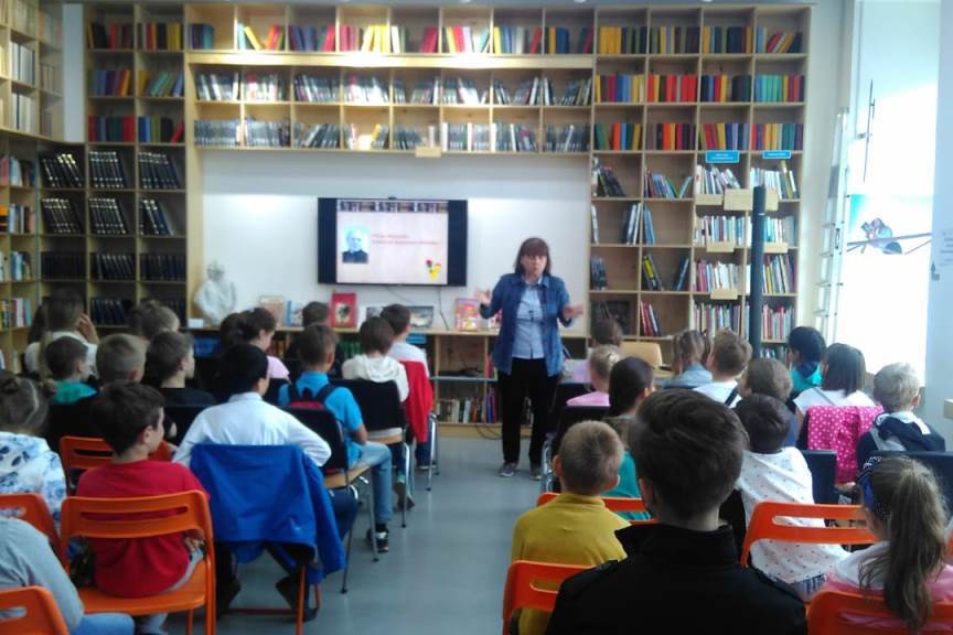 19 июня электронная презентация «Папа» Мурзилки», книжная выставка «С любовью к России» и рассказ библиотекаря познакомили ребят из летнего лагеря гимназии №1 с трудной, но интересной жизнью писателя.