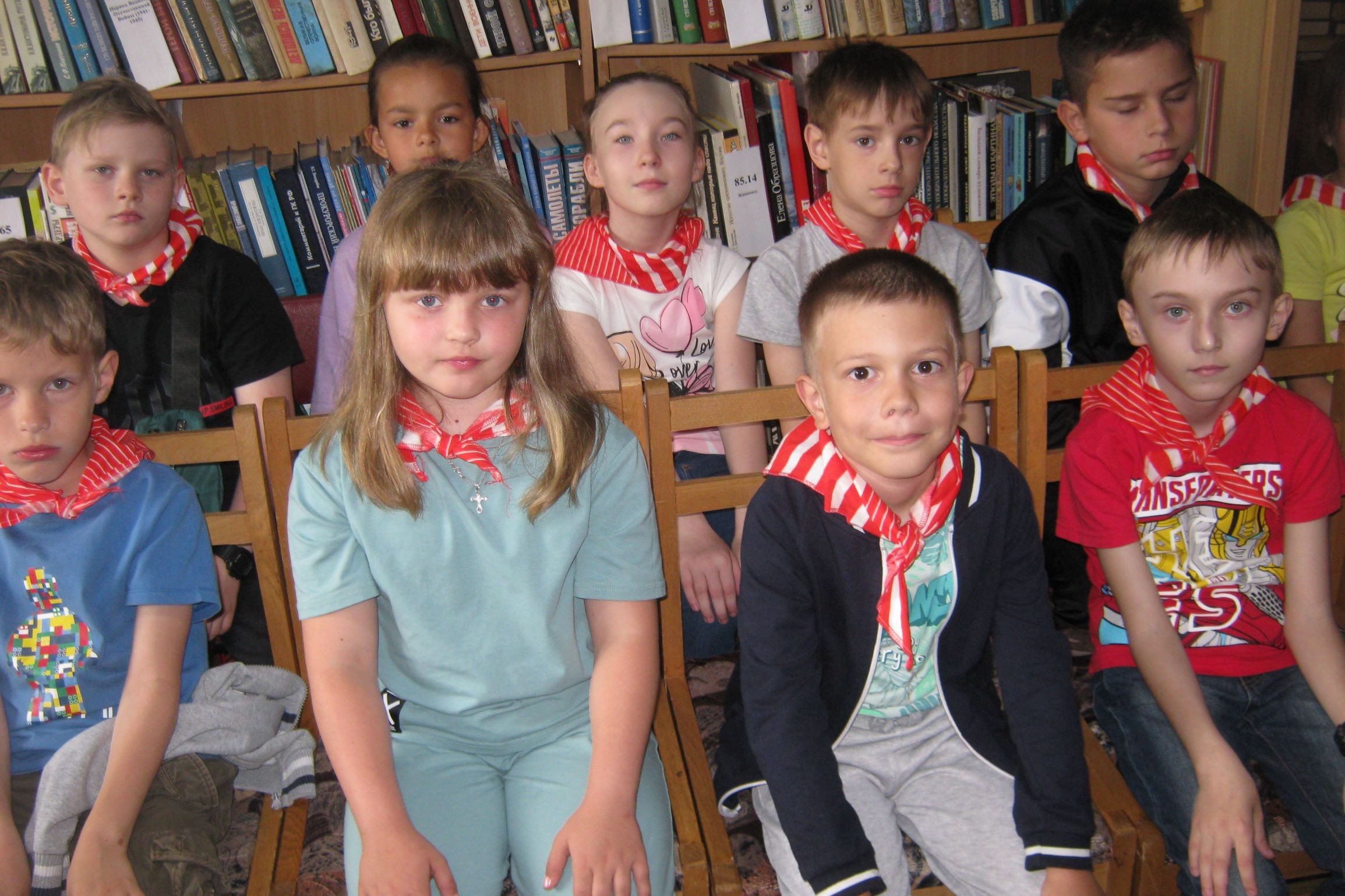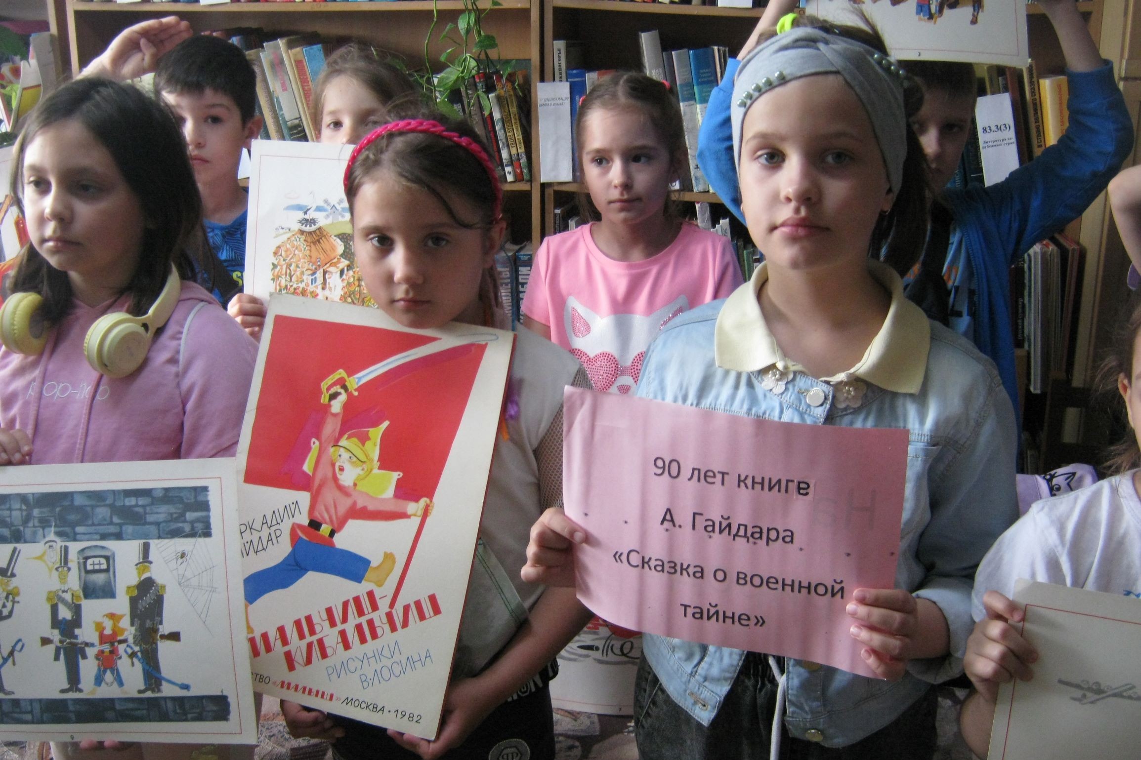 Днями ранее, 13 июня, на очередной встрече с ребятами из пришкольного лагеря СОШ № 54, библиотека № 15 приготовила для них творческую выставку в рисунках к юбилею – 90 лет «Сказке о военной тайне, о Мальчише – Кибальчише и его твердом слове». Автор сказки Аркадий Петрович Гайдар (1904 – 1941) (настоящая фамилия Голиков), детский писатель, красный командир, корреспондент газеты «Комсомольская правда. «Сказка о Мальчише – Кибальчише», написана по всем законам сказочного жанра, здесь есть главная тема сказок добро и зло. В сказке есть вестник – всадник, который появляется у окон дома Мальчиша три раза. Есть буржуины – олицетворение зла, пришедшее из – за Черных Гор. И отважные, простые землепашцы – воины – хранители справедливости и добра на русской земле. Есть и герой – в буденовке – шлеме, он настоящий богатырь, защитник Отечества. Выставка рисунков Вениамина Николаевича Лосева – художника, нарисовавшего сказку красками, желтыми и черными, синими и красными. Если рассмотреть внимательно эти рисунки, то можно увидеть всю сказку сразу. Сказка ребят тронула, они, затаив дыхание слушали историю смелого мальчика, который погиб, но не сказал, не выдал военную тайну.