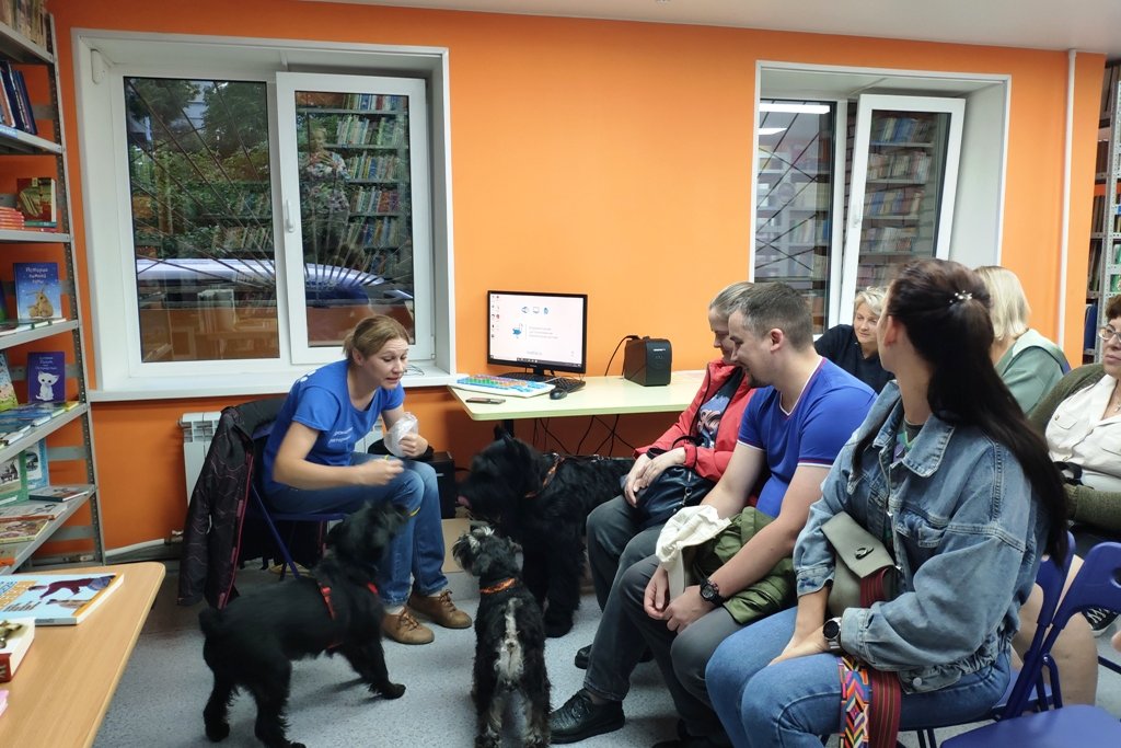 Занятие провели кинолог — зоопсихолог Екатерина Воронцова и миттельшнауцер Вольт, кинолог Лариса Костина и ее питомцы — цвергшнауцер Эрик и шестимесячный Ганс породы ризеншнауцер. Вольт и Эрик завсегдатаи встреч в библиотеке, а вот малыш Ганс побывал в библиотеке впервые. Все трое вели себя безупречно, ведь они питомцы профессионалов и своим поведением демонстрируют учащимся ШОС, как должна себя вести воспитанная собака.