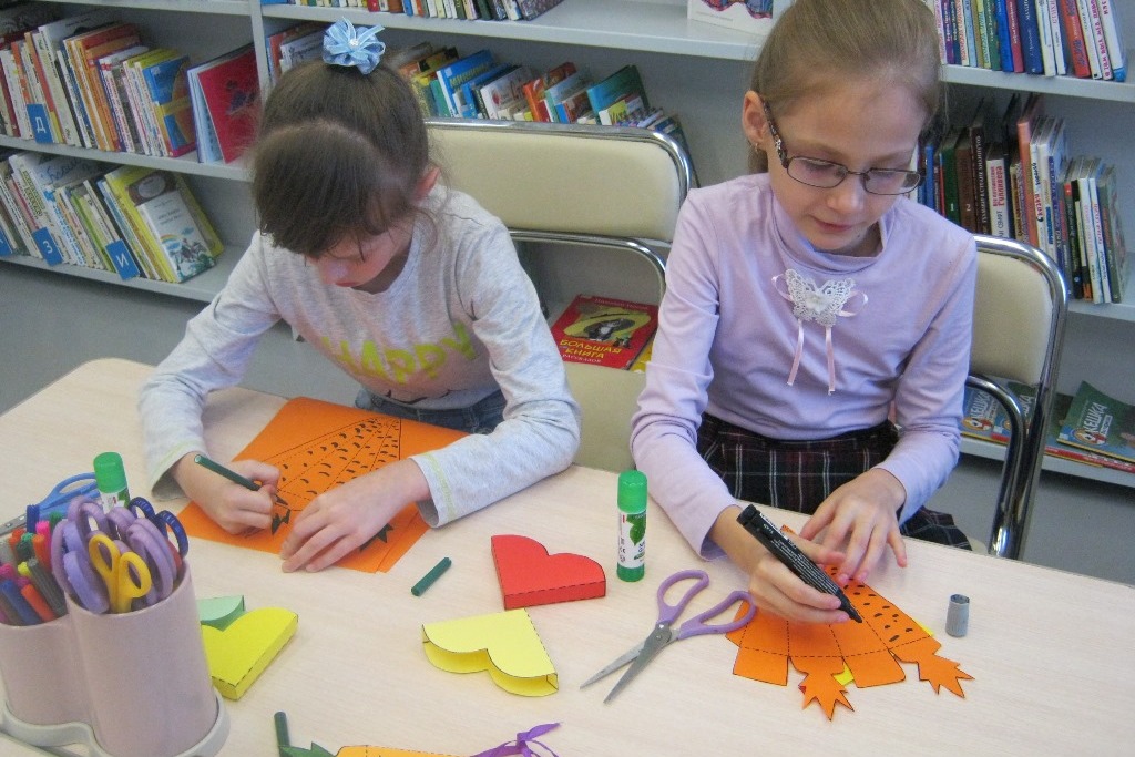 В библиотеке №8 продолжают свою работу творческие мастерские по вторникам. На занятиях девочки редко когда работают молча, обычно негромко беседуют, и в одном из таких разговоров выяснилось, что хорошо было бы научиться делать открытки и упаковки для подарков. Сказано – сделано! На одной творческой мастерской можно было научиться делать простую, но эффектную открытку с объемным львенком. На другом занятии девочки делали коробочки для мелких сюрпризов – разноцветные, перевязанные ленточкой. Оказалось, что коробочка – легкая и быстрая поделка, хватило времени и на морковку из цветной бумаги.