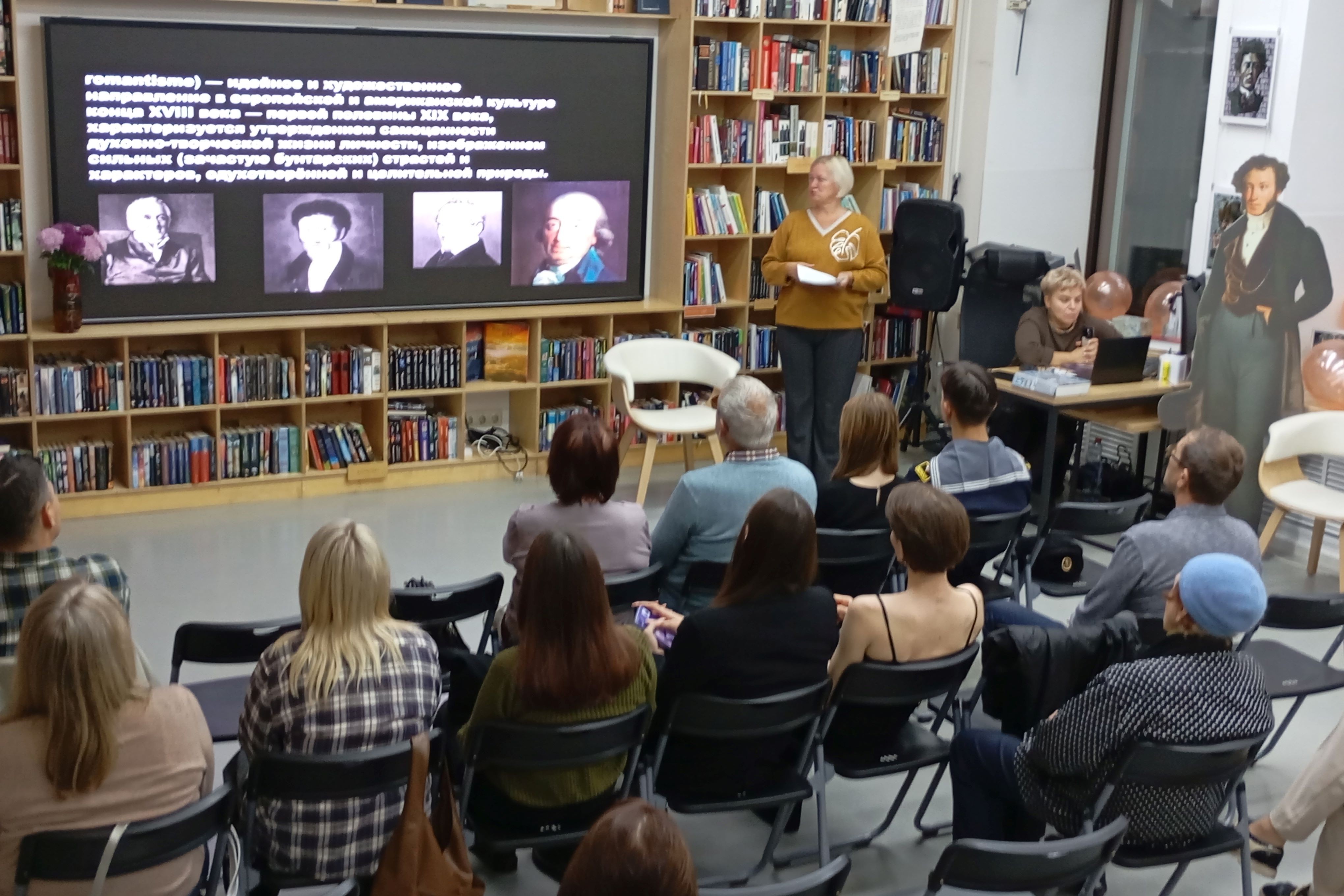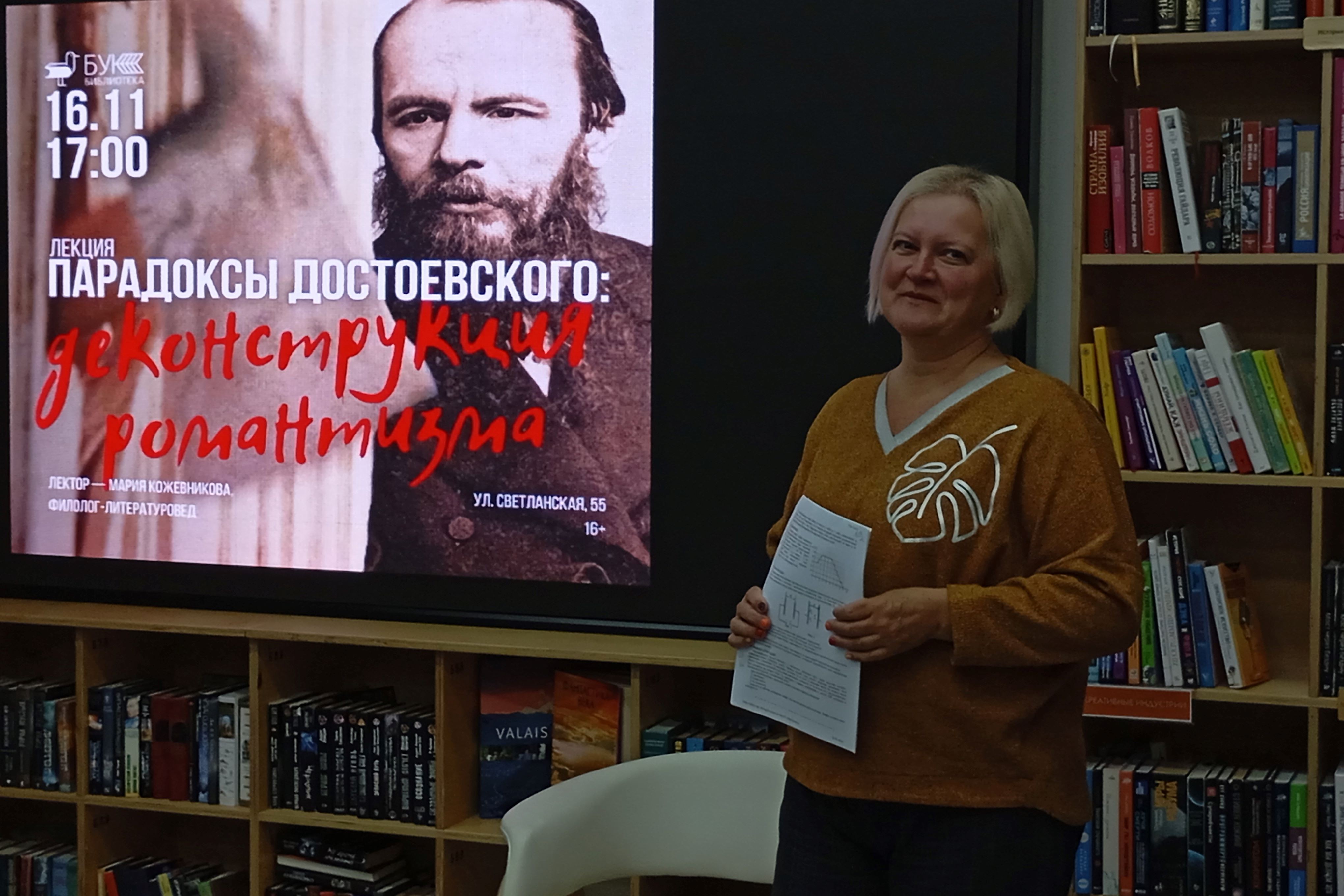 Библиотека БУК отметила свой 103 день рождения встречами с читателями, которые пришли, чтобы подискутировать с филологом-литературоведом Марией Кожевниковой о творчестве Ф.М. Достоевского, со дня рождения которого накануне прошло 203 года — «Парадоксы Достоевского: реконструкция романтизма» и «разобрать» криминальный гардероб Родиона Раскольникова с историком, исследователем моды Екатериной Шульгой.