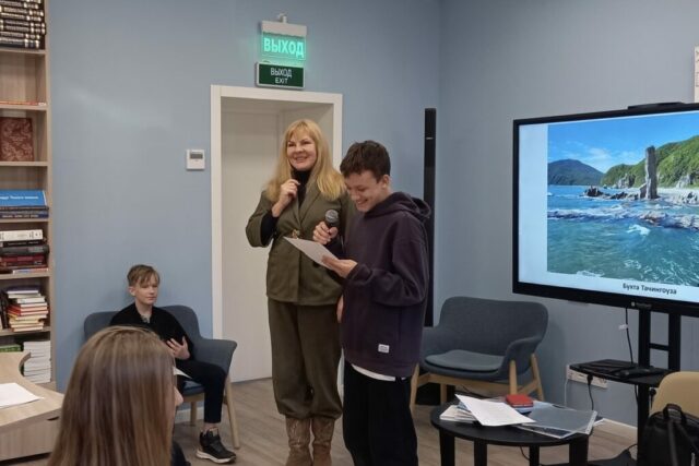 Главным содержанием встречи стало литературно-художественное издание Натальи Фориковой «Путешествие по Приморскому краю в стихах». Автор рассказала ребятам, что очень любит путешествия, и в каждом из них рождаются новые стихи. В этой книге собраны впечатления предыдущих двух лет посещения замечательных мест приморской земли. Даже названия островов, бухт, горных хребтов звучат, как песни, сказания в стихах, зовут посмотреть на них – Аскольд, Витязь, Тачингоуз, Чандалаз. Наталья Анатольевна видит и любит красоту природы и стремится языком поэзии передать её нам.