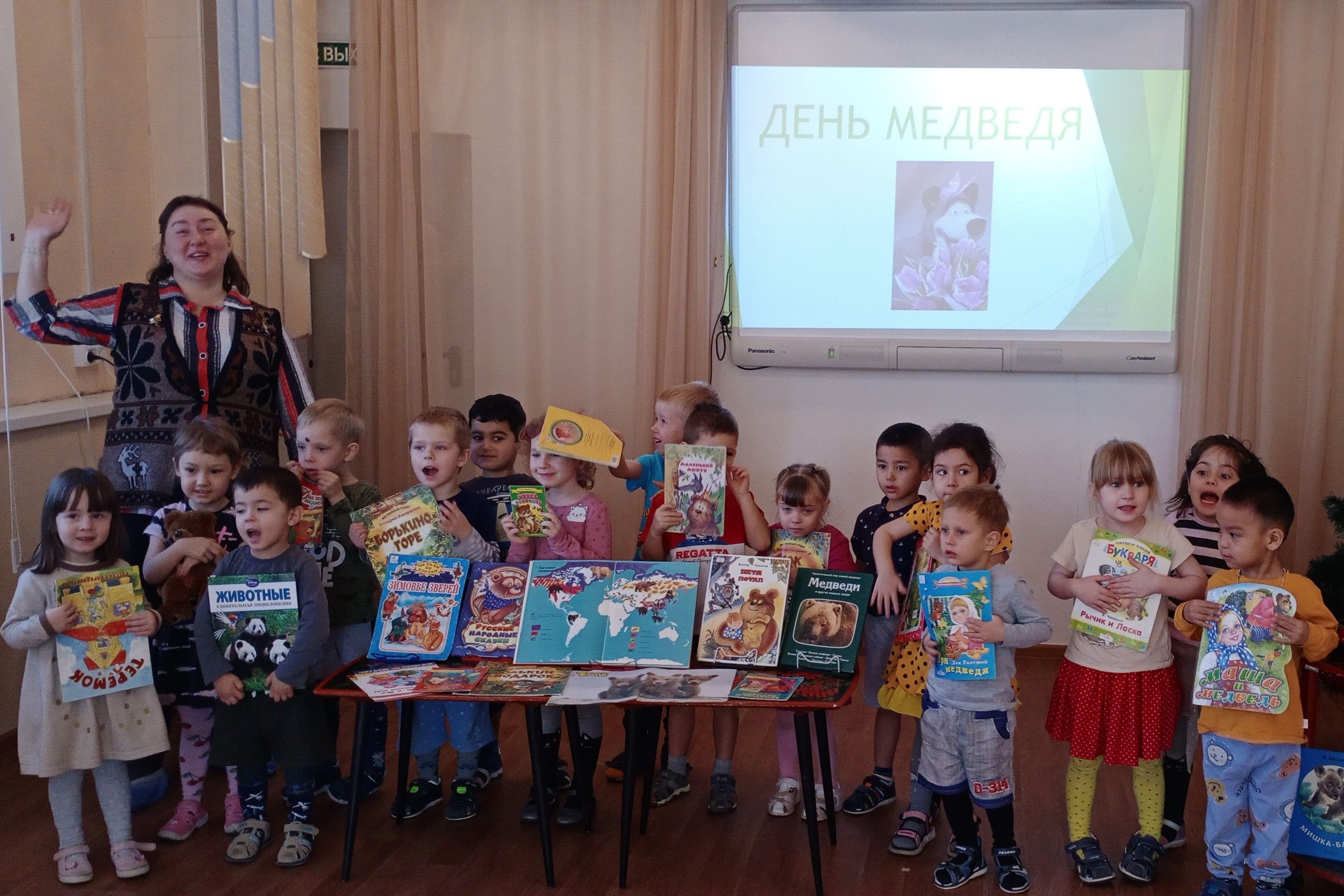 13 декабря библиотека № 9 провела литературно-развлекательную программу, посвящённую для воспитанников трёх групп детского сада № 97. Из презентации дошкольники узнали, что слово «медведь» означает «медоед», «поедатель мёда». Отличаясь по окраске, размерам и ареалу обитания, косолапые бывают бурыми, чёрными, белыми и чёрно-белыми (панды). Детям читали стихи Антонины Тесленко «Спит медведь в своей берлоге», Веры Праздничновой «Вышел из лесу медведь» и Валентина Берестова «Мишка лежебока», а также предлагали отгадать загадки о медведях. Ребята познакомились с разнообразными книгами и журналами на книжной выставке, где главный герой – добродушный и сильный мишка. Вспомнили самую любимую русскую народную сказку « Маша и медведь», которую все прекрасно знали.