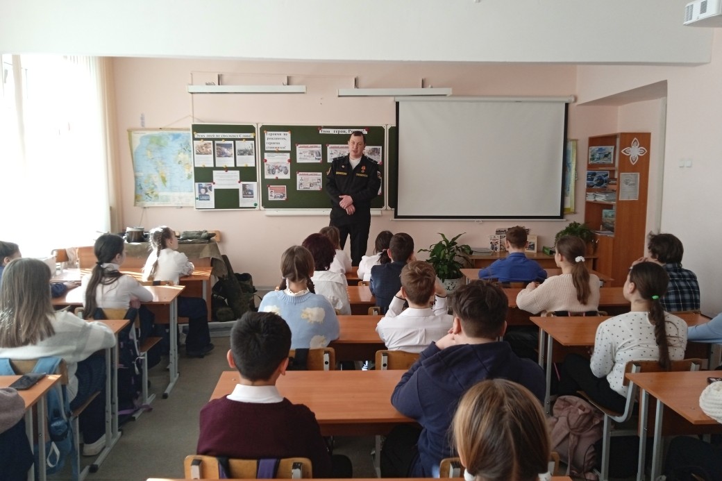 В течение школьного урока гость делился воспоминаниями, перенося слушателей на линию огня. Вспоминал погибших товарищей, как спасали раненых бойцов под вражеским огнем, как было страшно, но чувство долга и ответственности за товарищей всегда преобладало. Никита Олегович показал ребятам военное обмундирование: форму, рюкзак, фляжку, походную посуду и многое другое. Показал красные обвязки – один из отличительных знаков наших войск в открытом бою.