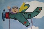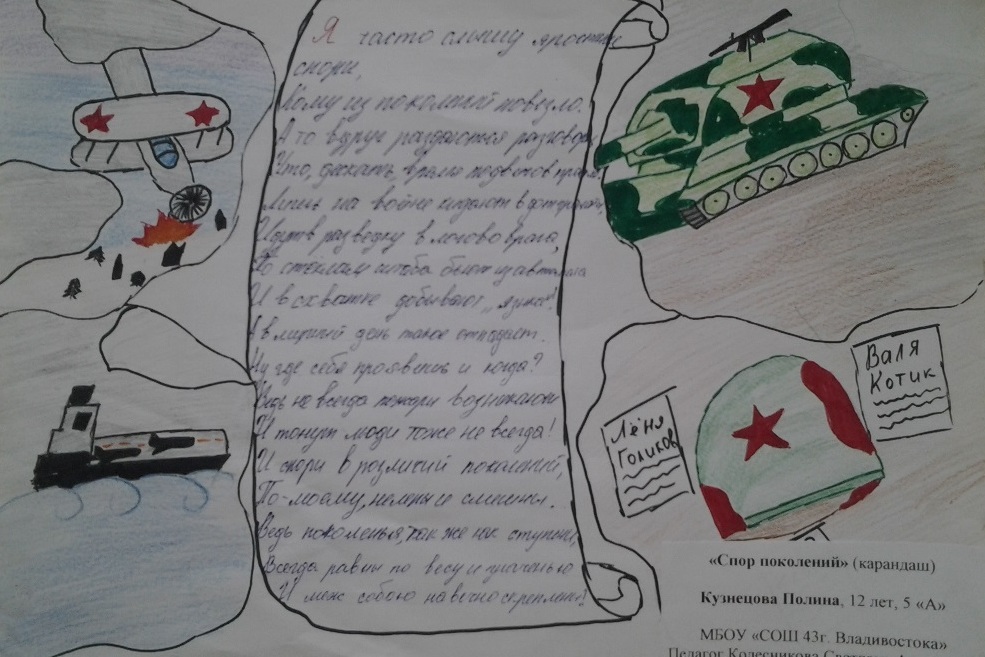 Интересен и необычен рисунок Кузнецовой Полины – он выполнен в смешанной технике. Полина использовала и цветной карандаш, и фломастер и тушь. Свой рисунок она назвала «Спор поколений», поместив в центр стихотворение «Я часто слышу яростные споры…» Э.Асадова, обрамив стихотворение зарисовками различных сражений – воздушный бой, морское сражение, танковая атака и увековеченные имена пионеров-героев Лени Голикова и Валентина Котика.