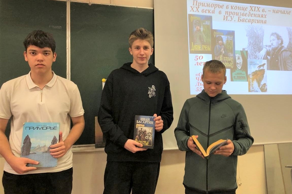 15 мая в рамках программы «Басаргинская строка» в 9 «А», 9 «Б» и 9 «В» классах МБОУ «СОШ № 64» проведены завершающие в этом учебном году занятия по теме «Край таёжный – Приморье», посвящённые знаковым датам: 175-летию с того времени, когда капитан I-го ранга Геннадий Иванович Невельской поднял русский флаг на мысе Куегда и основал Николаевский военный пост (ныне – город Николаевск-на-Амуре), что явилось началом присоединения Приамурья к России; юбилейным датам Владивостока; 165-летию официального признания Уссурийского края российским, а также 55-летию со времени первой публикации повести И.У. Басаргина «Сказ о Чёрном Дьяволе» и 50-летию со времени выхода в свет двух первых романов тетралогии «В горах Тигровых», в которых на протяжение десятилетий показано заселение и освоение восточной окраины нашего государства.