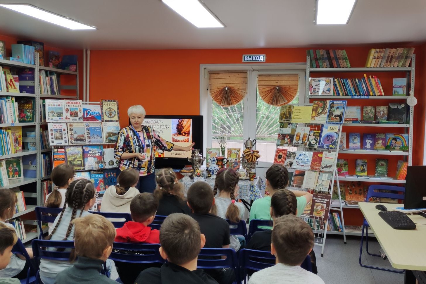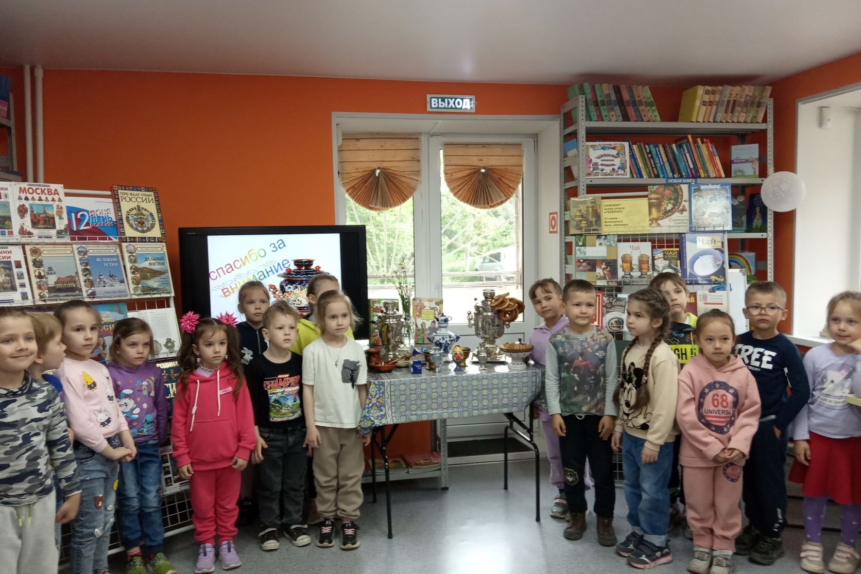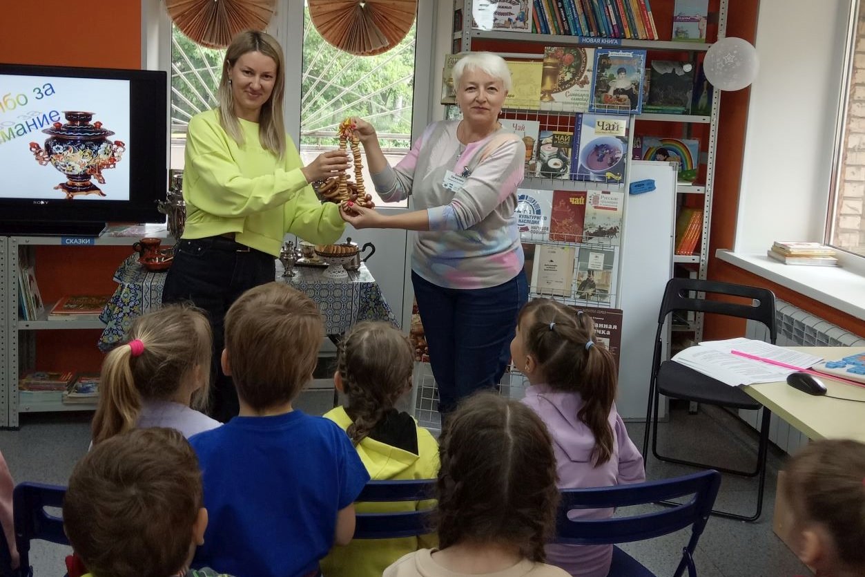 Красочная книжная выставка о самоварах и о чае, выставка самоваров никого не оставили равнодушным. Каждая группа гостей в конце мероприятия получила подарок – вязанку сушек с самовара. Народная культура — основа национальной культуры, позволяющая на реальных и достигнутых примерах открыть перед учащимися нравственные ценности русского народа: трудолюбие, милосердие, любовь к природе, родной земле.