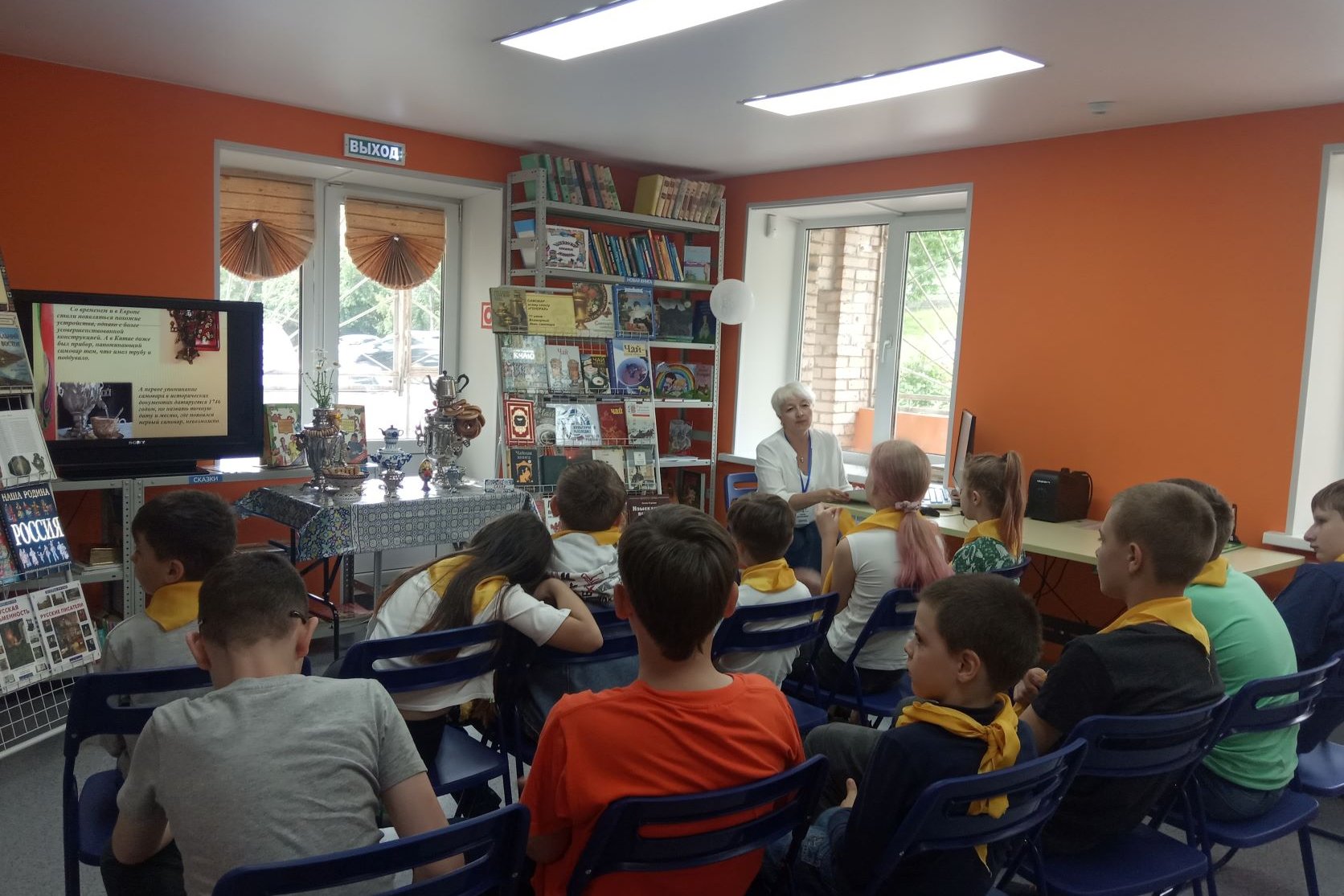 Для ребят и взрослых библиотекари подготовили красочные презентации, викторины, участники мероприятий погружались в атмосферу народных промыслов России и в историю создания такого замечательного изобретения человеческой мысли, как самовар. Мы рассказали ребятам как о Дне России, о государственных символах нашей страны, так и о символах не государственных, но узнаваемых и любимых: это и русская матрешка, и хохломская роспись, и ромашка, и конечно, самовар.
