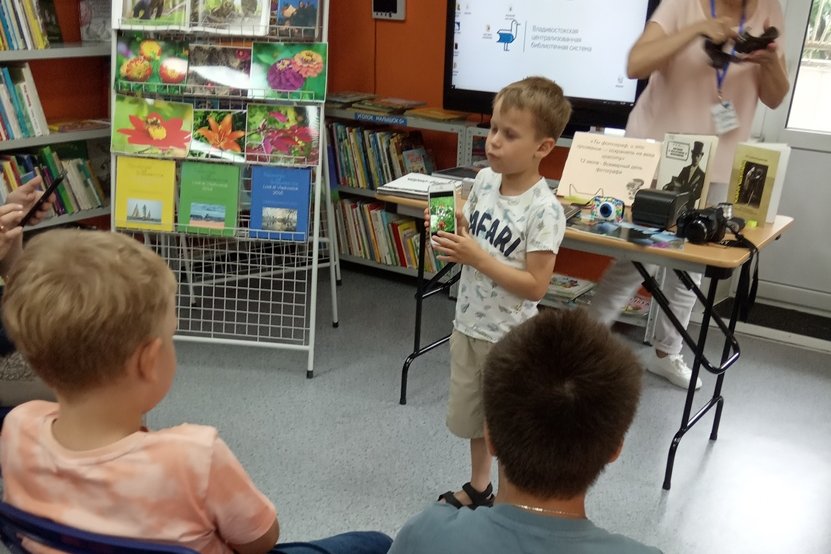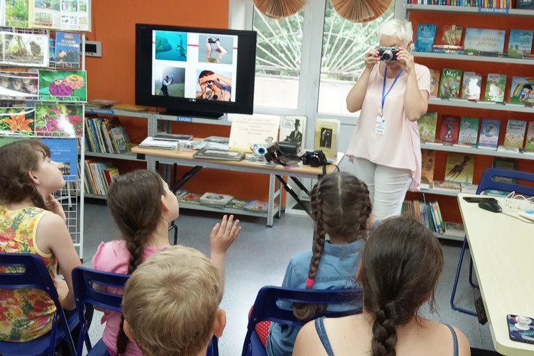 13 июля для детей, отдыхающих в отряде «Спутник» городского летнего лагеря при ЦДТ Советского района, сотрудники библиотеки №20 провели интерактив «Ты фотограф, и это призвание — сохранять на века красоту» (12 июля — Всемирный день фотографа). Ребята накануне получили задание сделать смартфонами несколько уличных снимков, пока будут идти в библиотеку, а также вместе сфотографировали у библиотеки клумбу с цветами, окрестные сопки и дома, друг друга. Продолжился интерактив в детском зале библиотеки. С помощью красочной презентации ребята узнали историю появления фотографических аппаратов, первых фотографов, черно-белых, цветных и 3D фотографий. С восторгом рассматривали они фотоаппараты из частной коллекции заведующей библиотекой Елены Янсон, ведь там есть и ФЭД-2 (советский фотоаппарат, выпускавшийся с 1955 по 1970 год), и камера мгновенной печати, и современные фотокамеры. День фотографа удался на славу. Дети узнали много интересного и запечатлели свои радостные мгновения, а в конце интерактива каждый продемонстрировал свои шедевры на большом экране. Стоит отметить, что каждый ребенок проявил свой талант: кто-то мастерски сделал портреты, кто-то запечатлел капельки росы и туман, а Рита Касьянова оказалась мастером селфи – ее работы были признаны всеми детьми самыми-самыми…