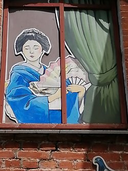 В этом уголке Старого дворика ГУМа Давид Давидович не один. Из окна на него смотрит японка с веером: