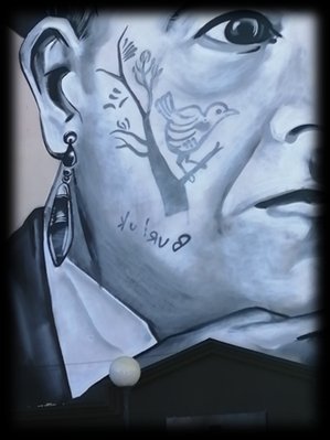 Эпатажный Бурлюк предвосхитил появление панков – эта субкультура, если верить Википедии, возникнет в конце 1960-х — начале 1970-х годов и в странах, далеких от России (в Великобритании, США, Канаде и Австралии). Художники ХХI века тщательно воспроизвели все черты и особенности лица и облика Давида Давидовича, уделив особое внимание рисунку на правой щеке, занимавшему «территорию» от линии рта до брови: птичка на ветке. Не забыли и про объемную серьгу в правом же ухе.