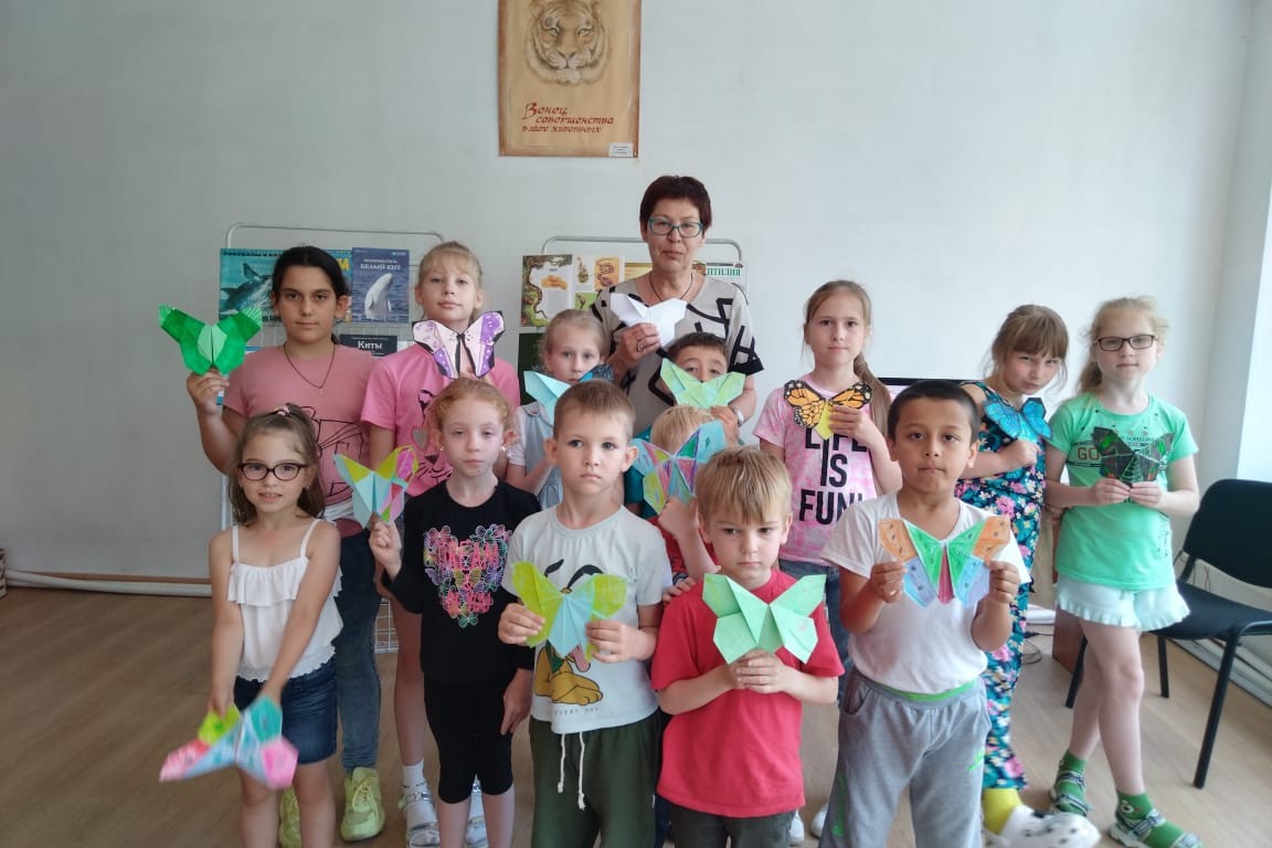На литературном часе «Киты и бабочки» юным читателям рассказали о писателе-натуралисте и экологе Владимире Тройнине, познакомили с его книгой «Рассказы о китах», в которой он не только рассказывает об образе жизни гигантов моря, их повадках, привычках и поведении, но и передаёт своё восхищение перед их красотой, бесстрашием и силой. Владимир Ильич был и фанатом бабочек, фотографировал этих непоседливых «фотомоделей». Он уверял, что долгое созерцание нарисованной или сфотографированной живой бабочки способно не только доставлять эстетическую радость, но и исцелять. Посмотрев презентацию с бабочками, дети своими руками смастерили бабочку-махаона в технике оригами и раскрасили ее.