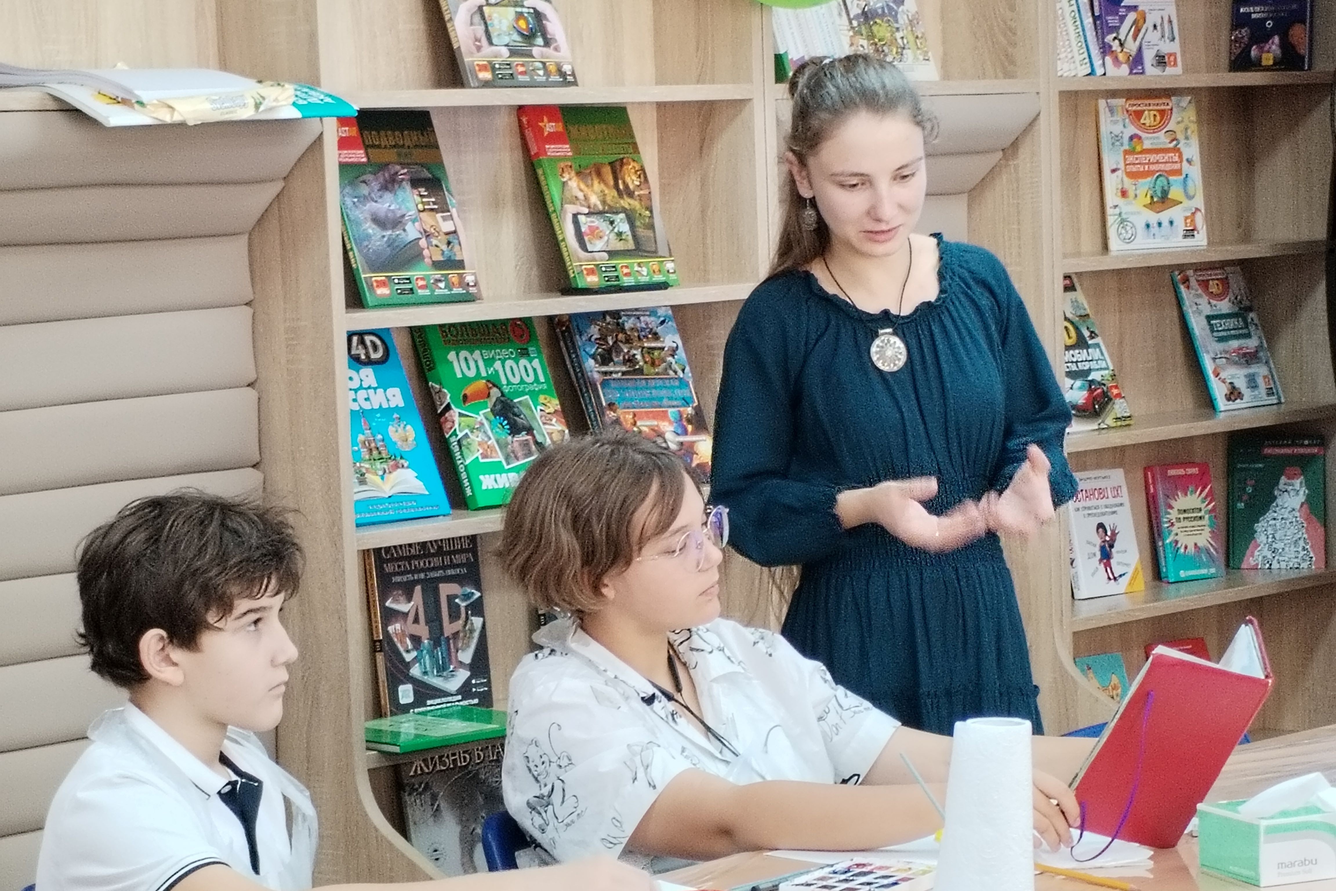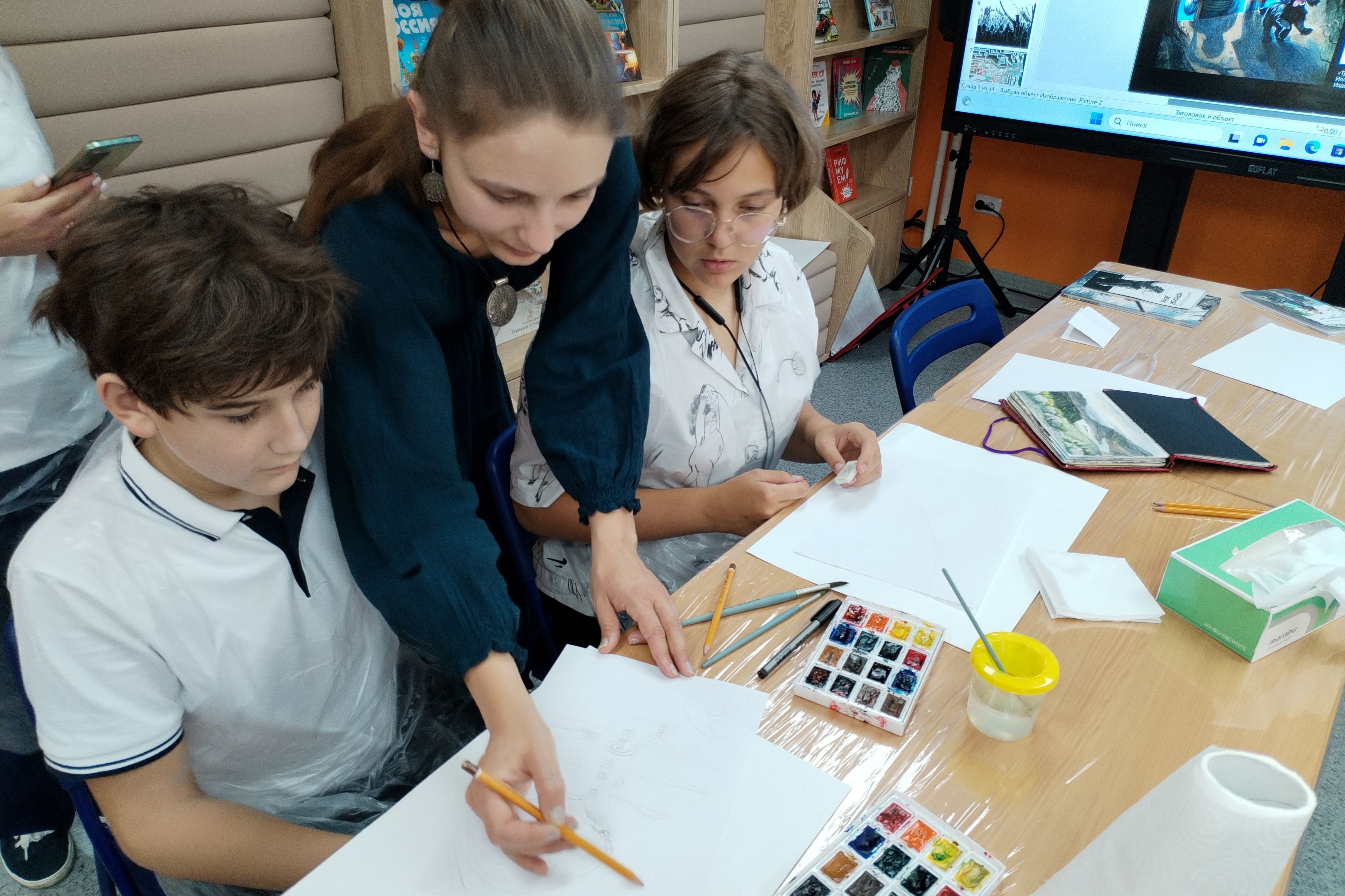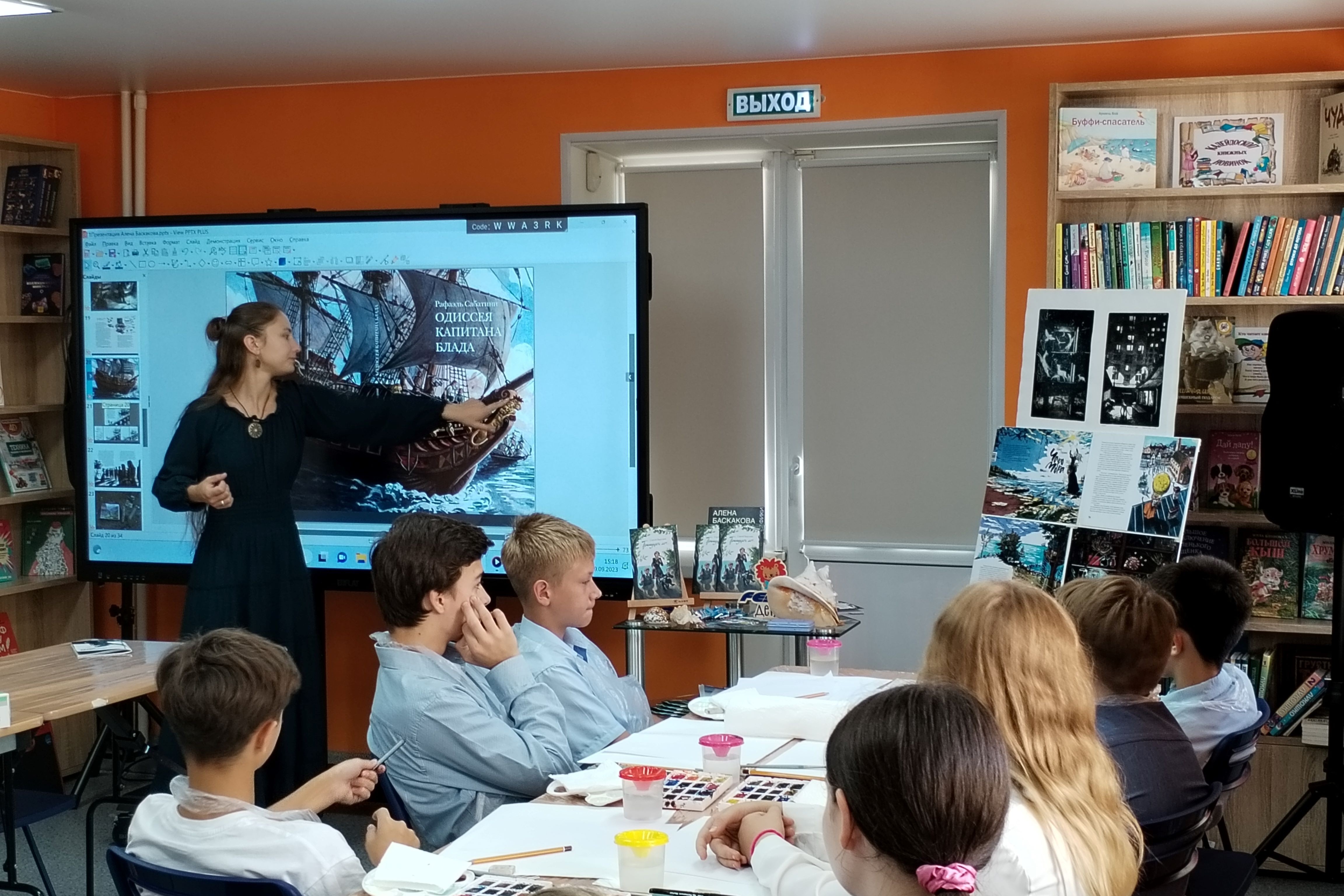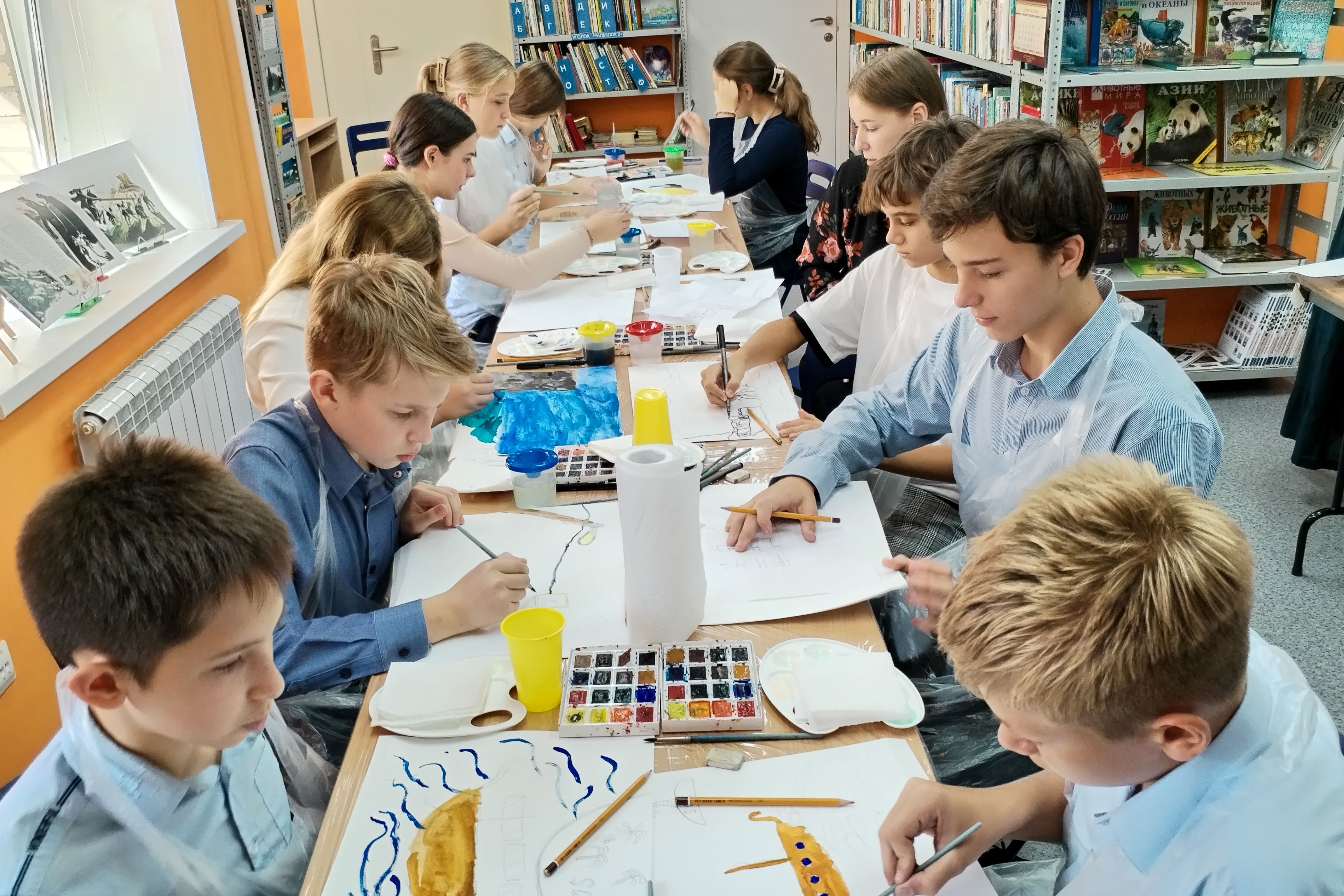 Школьники приняли активное участие в интерактивной программе, с увлечением делали сначала наброски, а потом каждый написал свою картину. Мастер-класс никого не оставил равнодушным, полету фантазии не было границ. В конце мероприятия каждый участник получил в подарок книгу «Тринадцать лет…» Сергея Баруздина, памятную открытку с добрыми пожеланиями от Алены Баскаковой и маленький сладкий сюрприз.