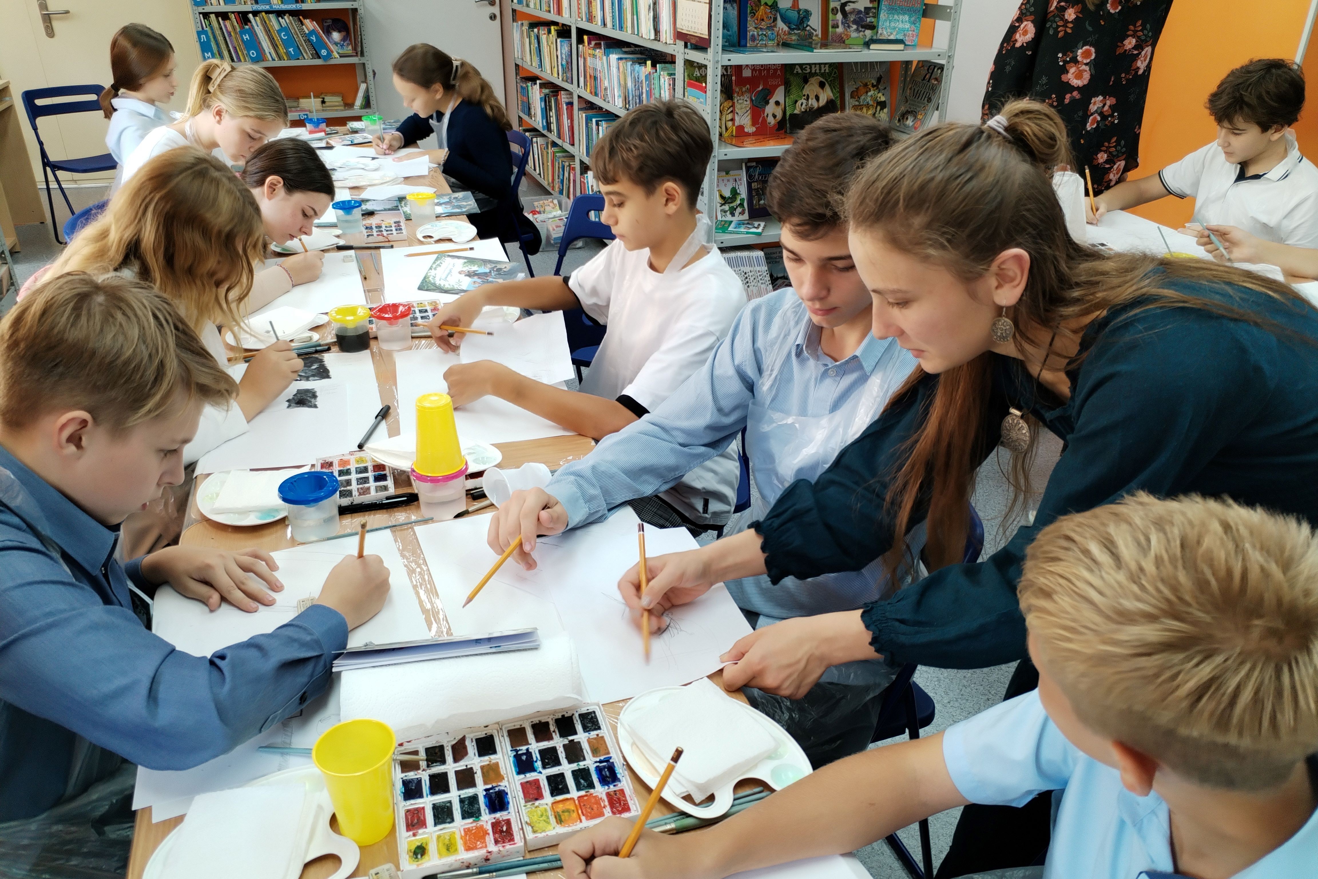 Школьники приняли активное участие в интерактивной программе, с увлечением делали сначала наброски, а потом каждый написал свою картину. Мастер-класс никого не оставил равнодушным, полету фантазии не было границ. В конце мероприятия каждый участник получил в подарок книгу «Тринадцать лет…» Сергея Баруздина, памятную открытку с добрыми пожеланиями от Алены Баскаковой и маленький сладкий сюрприз.