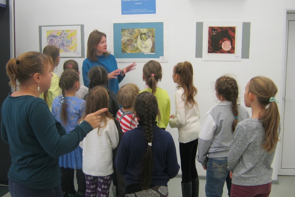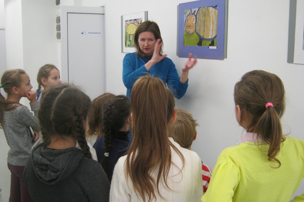21 ноября в библиотеку №8 пришли воспитанники Изо-студии «От и До» ЦРТДиЮ посмотреть новую выставку. Фотографии Тайланда, Лаоса и Пекина в галерее библиотеки сменили работы из фондов Детского музея Приморской Государственной Картинной Галереи. Новая экспозиция называется «Гуляют кошки по бумаге», сразу понятно, что за зверь изображен на рисунках. Вместе с преподавателем студии, Екатериной Чистяковой, дети обсудили такие случаи оформления картины, когда рамка активно оттягивает на себя внимание, почему цветное паспарту должно быть такого оттенка, какой присутствует на работе или сочетаться с палитрой изображения, почему белое паспарту – это самый нейтральный вариант. Дети попробовали дать более конкретные определения цветам на работах, например, не просто синий, а черничный, не просто оранжевый, а кирпичный, не зеленый, а травяной.