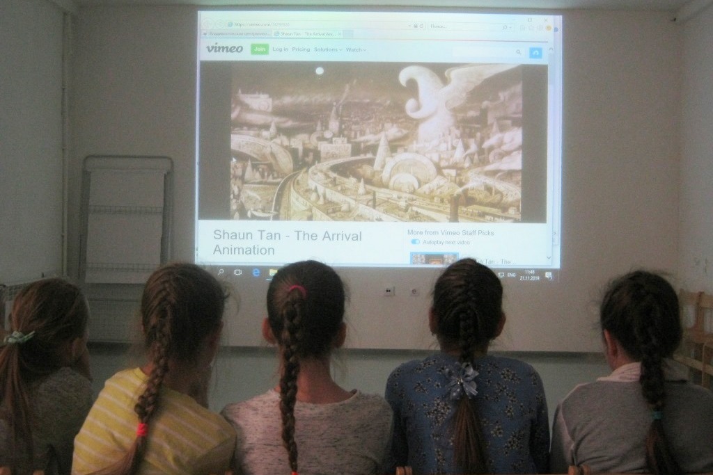 В кинозале детвора посмотрела видео по комиксу «Arrival» талантливого австралийского художника Шона Тана. Город, в который прибывает иммигрант, населен не только людьми. В каждой квартире с человеком соседствует дружественная хозяину зверюшка.