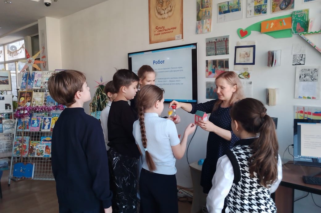 Преподаватель разбила детей на пары, один из них стал роботом, другой взял на себя роль оператора и определил траекторию движения. Роботы «запустились», и библиотека наполнилась движением и звукам команд. После упражнения-игры уже легче было ответить на вопросы о будущем роботов. Подростки уверено решили, что вычисления и точные манипуляции будут делать роботы, а вот творчество, чувства и мышление навсегда останутся за людьми.