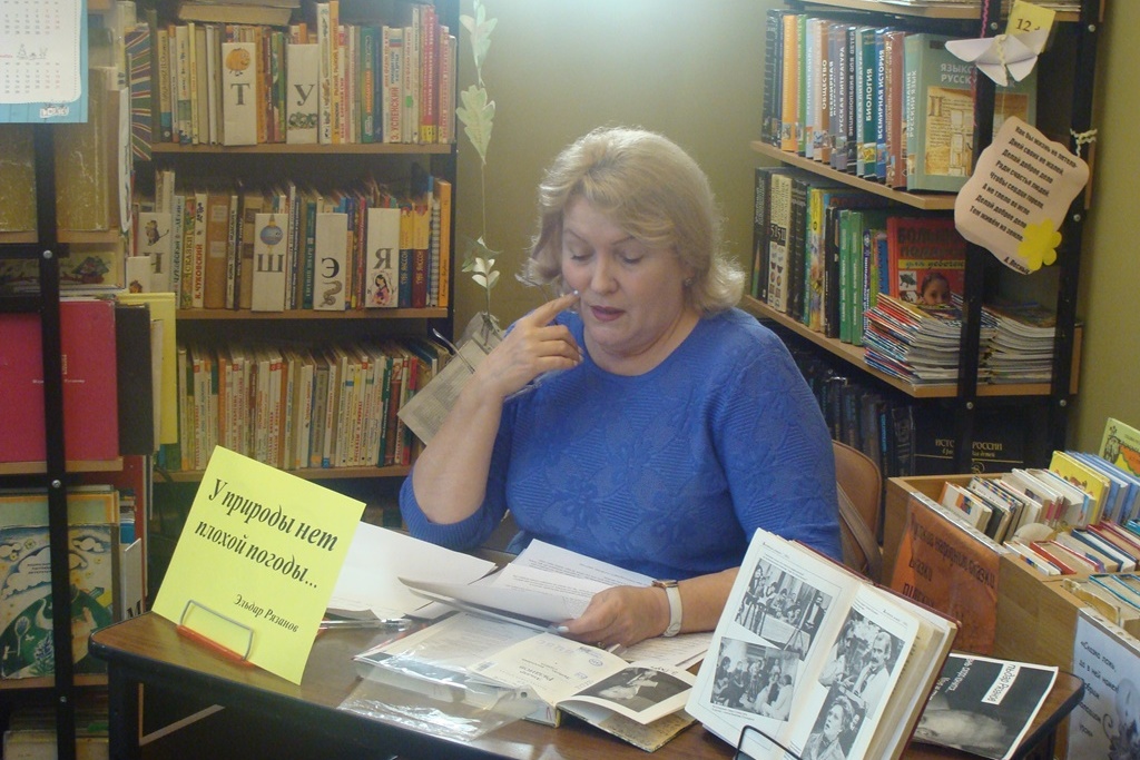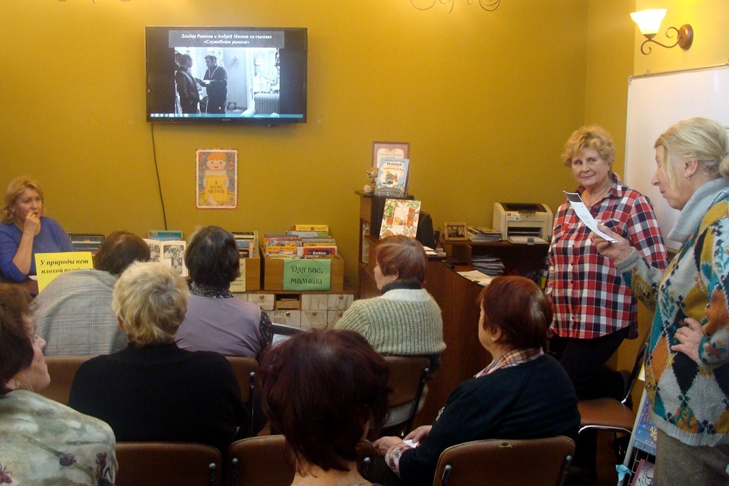 В прошедшую среду библиотека № 4 организовала для клубного объединения «В мире прекрасного» литературно-музыкальную гостиную «У природы нет плохой погоды…». Героем литературно-музыкальной встречи стал всенародно любимый, многогранный поэт, кинорежиссёр, сценарист, драматург, телеведущий и актёр Эльдар Александрович Рязанов.