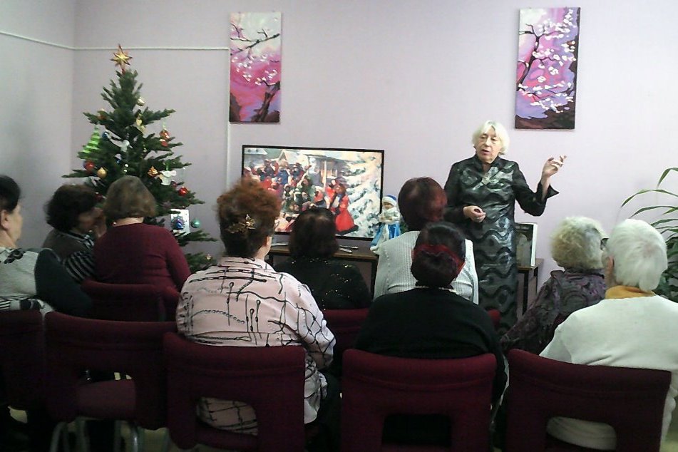 Сначала собравшиеся познакомились с выставкой книг о русских народных обычаях и праздниках, связанных с этим временем. О зимних праздниках: Сочельник, Рождество, Старый Новый год, Крещение – много интересного и нового рассказала краевед-экскурсовод, член Русского географического общества Шашкова А.К.