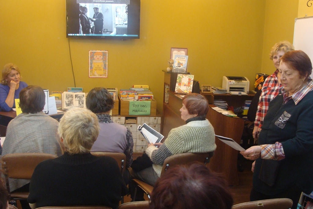 Все присутствующие с удовольствием посмотрели и вспомнили неповторимые песни автора из лучших советских кинофильмов Рязанова. Слушатель клубного объединения Юрченко Любовь рассказала о творческом пути Э. Рязанова, привела множество цитат автора. Присутствующие исполнили любимые песни на стихи Рязанова, читали жизненные, ироничные и автобиографичные строки.
