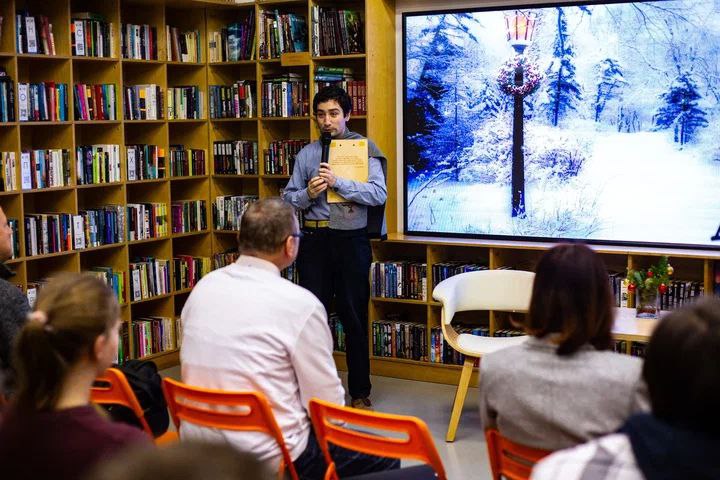 Открыл вечер стихотворением «Рождество» Клайва Льюиса Савелий Грамматик. Как свои авторские стихотворения, так и произведения классиков прочитали Ксения Гладкова, Фёдор Ильин, Павел Носырев, Иван Пискарев, Маргарита Халиман и Татьяна Фёдорова. Дебютантами поэтических вечеров «Голоса логоса» стали Владислав Гапотченко и Джой. Вдохновились выступлениями и тоже вышли на сцену, чтобы прочитать стихотворения, гости мероприятия Анастасия Кукса, Надежда Ли и Никита Цыганов. Традиционно закрыл вечер директор школы № 6 п. Новый Михаил Эдуардович Скобенко, прочитавший произведения Ирины Самариной и Роберта Рождественского.
