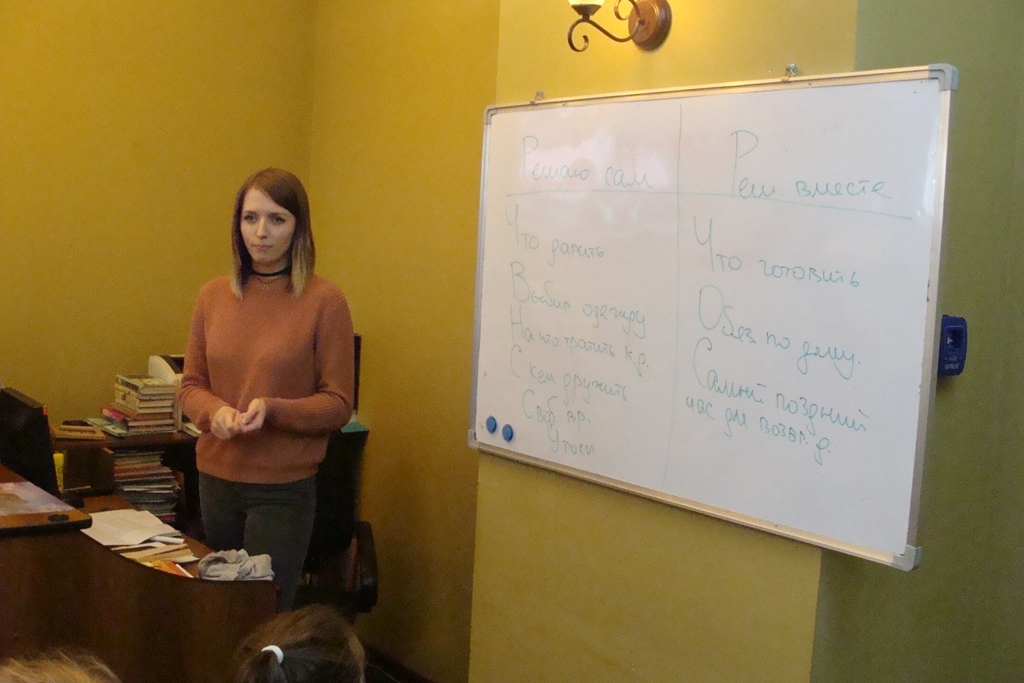 На уроке говорили с детьми о том, какие конфликты бывают во взаимоотношениях с родителями, чем они могут быть вызваны, как в этом случае себя вести. Как искать компромисс или договариваться, если вы в чем-то не согласны. Детям была приведена в пример таблица решений, которую они могут составить дома с родителями и обсудить некоторые семейные вопросы, и тем самым они будут развивать в себе самостоятельность.