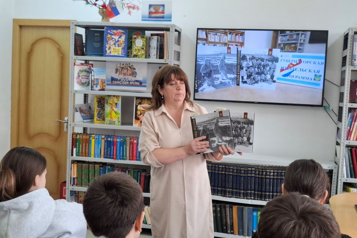 В рамках второго этапа краевого проекта «Как пройти в библиотеку!?!» в библиотеке № 16 для подростков из СОШ № 43 состоялась презентация исторического альбома к 55-летию Даманских событий. В 2-х книгах: «Стали в бою героями» и «Горячий лед Уссури». Издание выпущено в рамках Губернаторской издательской программы.