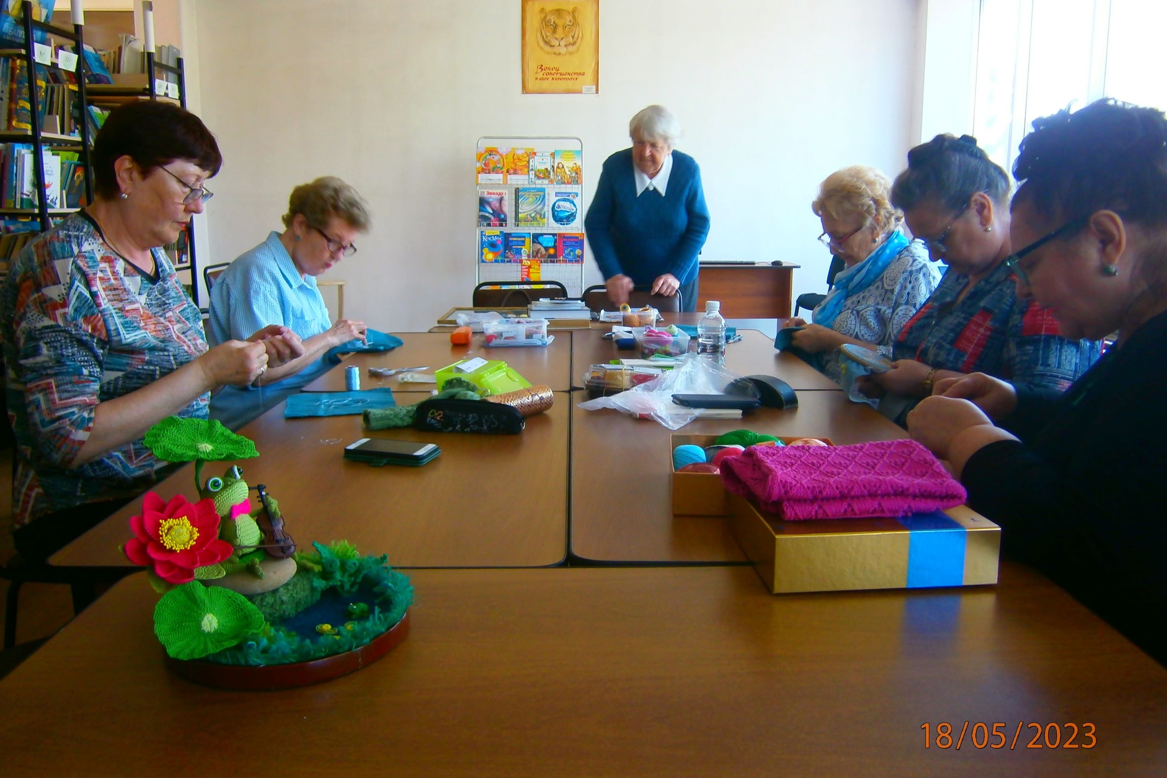 Творческая мастерская «Руками вышитое чудо» для старшего поколения читательниц продолжает работать в библиотеке №3. 18 мая здесь представила свои работы руководительница кружка Галина Степановна. Это панно «Арабские мотивы», вышивка в стиле крюил (якобинская вышивка), с характерными причудливыми витыми мотивами. Дополнительно использованы бисер и сетка. Галина Васильевна представила домашнюю работу «Музыкальный пруд» — вязаная композиция с использованием дополнительных подручных безделушек. На занятии рукодельницы продолжили практиковаться, вышивая элементы в стиле крюил, активно обменивались идеями.