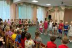 Потом все вместе решали, что же подарить имениннику. Пели веселые песни, выразительно читали стихи, а затем, выстроившись в длинные цепочки, под музыку накручивали всю цепочку, пока не получился большой «торт». Главное условие при этом было – руки не расцеплять. А чего не хватает на именинном торте? Конечно, свечек! И все подняли руки вверх. Получилось целых шесть «тортиков» по количеству групп.