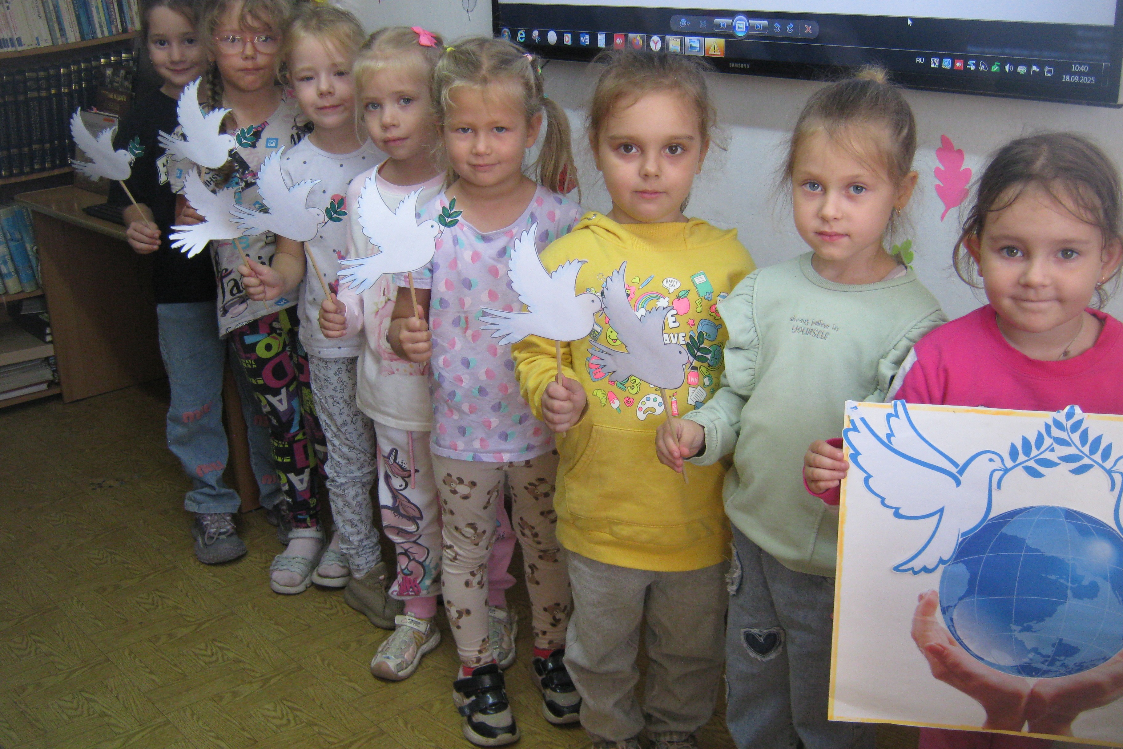 Детям рассказали, что символом мира был выбран белый голубь с оливковой веточкой в клюве. Именно голубь принес добрую весть Ною, о суше в бесконечном море, где плавал ковчег. «Голубь мира» был в библиотеке, малыши так искренне радовались поделке, а с осенними листиками, было еще нарядней. Дошкольники послушали беседу, ответили на вопросы викторины, которые требовали внимания и логического мышления.