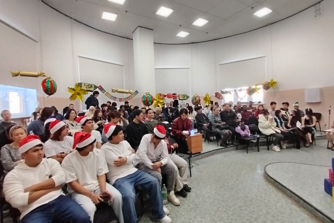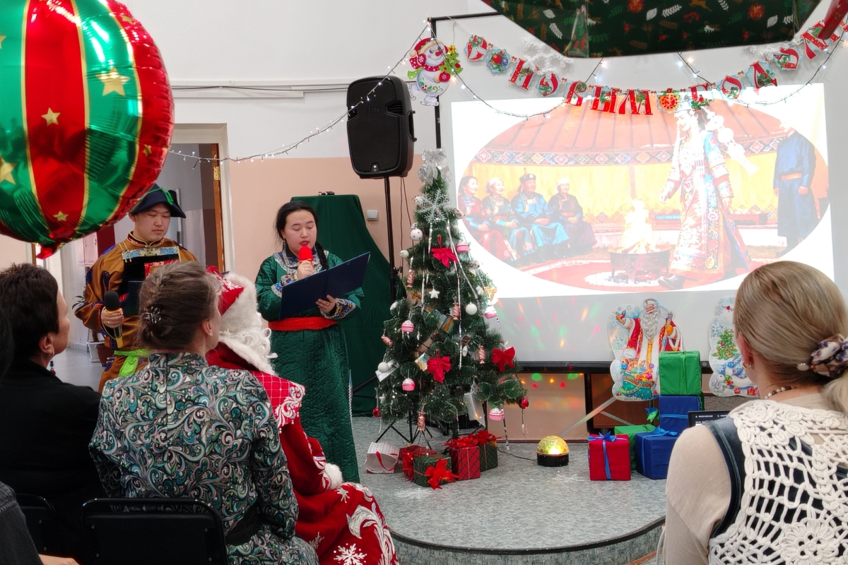 Праздник начался с игр со сказочными героями: Дедом Морозом, Снегурочкой и Колядочницами. Сначала прошла весёлая лингвистическая игра: Дед Мороз называл часть тела, которую собирался «заморозить», а слушатели дружно её прикрывали. Затем Колядочницы вовлекли всех в общий танец, показывая движения, которые гости повторяли, сидя на своих стульях. Атмосферу веселья поддержала и игра с передачей мягких подарков под музыку — тот, у кого игрушка оставалась после остановки музыки, выполнял задание: танцевал с соседом или делал «зарядку».