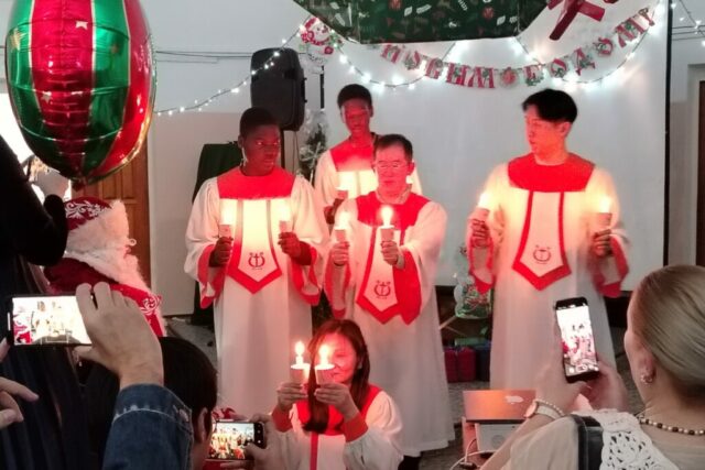 Культурный обмен продолжился и в формате викторины, где участники отвечали на вопросы: «какой самый новогодний фрукт?», «кто друг Деда Мороза и Снегурочки?», «каких цветов бывают шубы у Деда Мороза?». За правильные ответы инициативные гости получали сладкие призы. Приятным завершением вечера стал торжественный Рождественский хореографический этюд со свечами в исполнении слушателей из стран Азии и Африки.